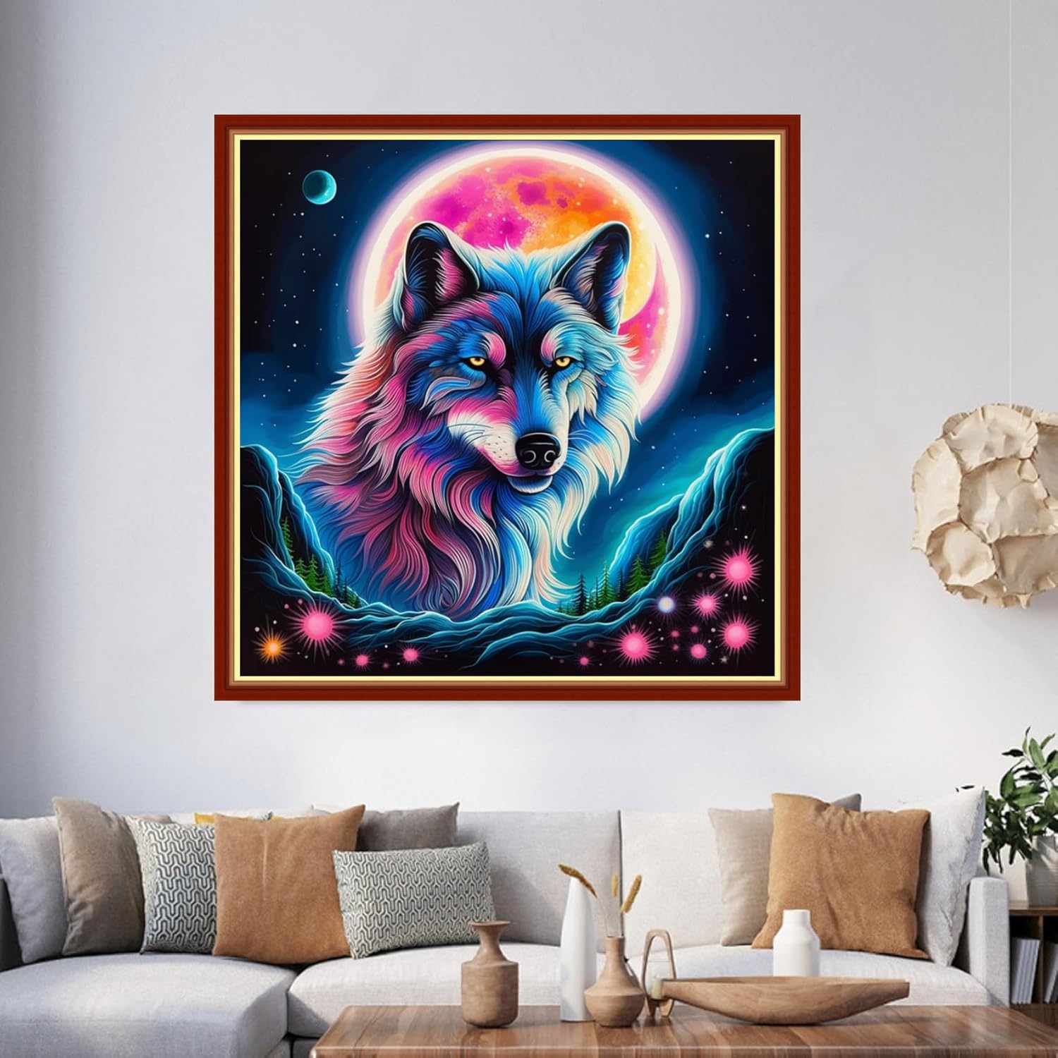 Foxhool Beginners Cross Stitch Kits Stamped Full Range of Embroidery Kits for Adults DIY Cross Stitches kit Embroidery Patterns for Needlepoint kit-Colorful Moon Wolf 17.7x17.7 inch