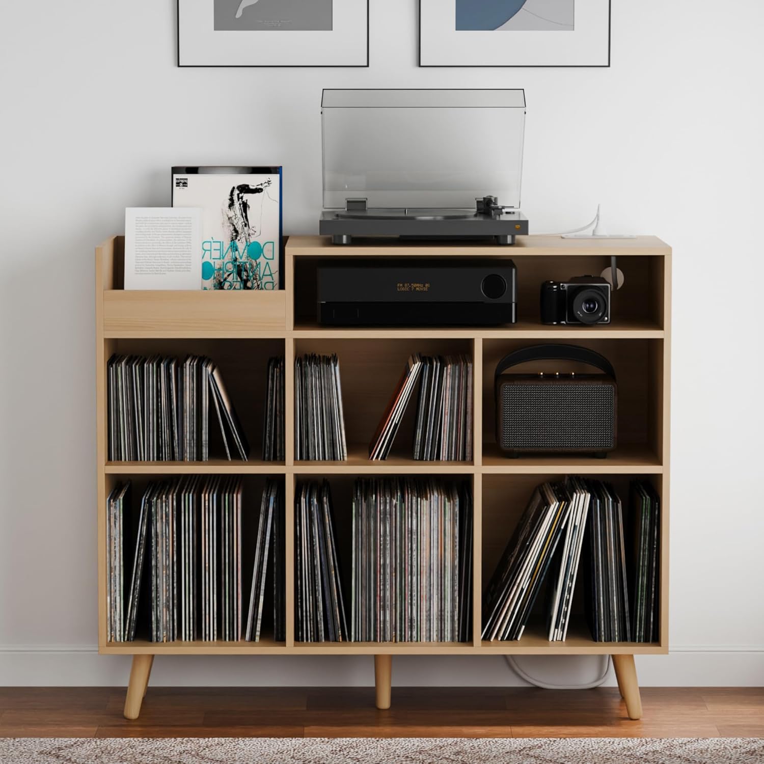 Cozy Castle Large Record Player Stand, Vinyl Storage Cabinet Mid Century Modern Turntable Stand Media Console Table Open Shelf Cube CD Album Holder Organizer for Living Room, Office, Oak
