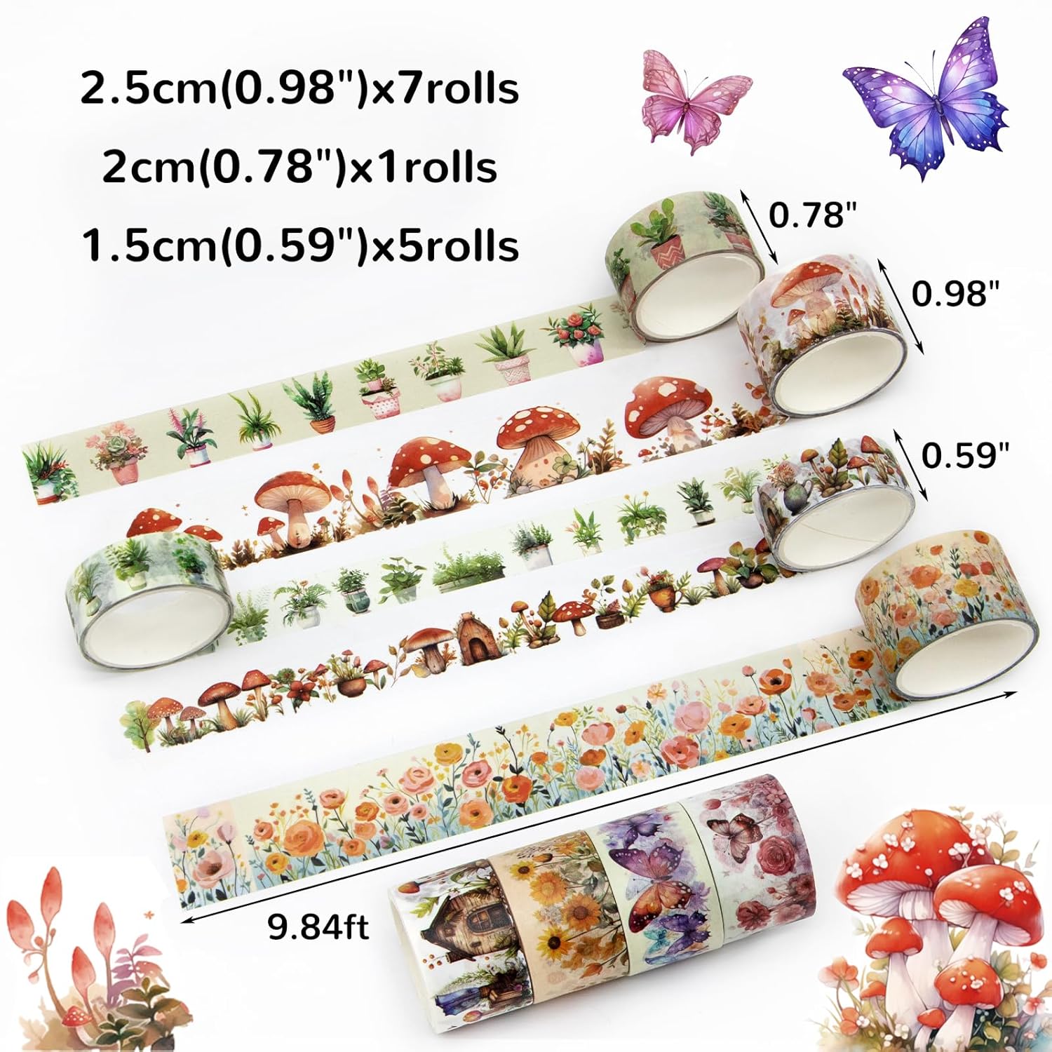 Washi Tape Set 13 Rolls - Mushroom Butterfly Floral Decorative Tape, Colored Masking Tape for Scrapbooking Supplies, Bullet Journal Supplies, Junk Journal, DIY Crafts Art