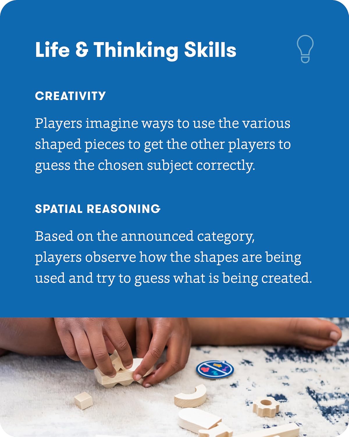 - DEVELOP CREATIVITY: In this fun game for kids, players develop their creativity skills as they imagine ways to use the various shaped pieces to create the subject from their cards. Card topics include things, beings, places, events, and activities.