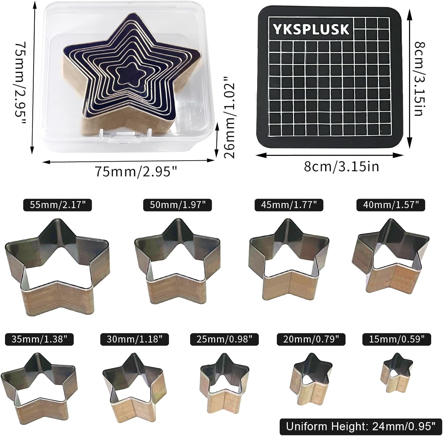 - 【9 Sizes Star Cutter Set】This package includes 9 pieces Star holes in 9 different sizes. Diameter: 15mm(0.59"), 20mm(0.79"), 25mm(0.98"), 30mm(1.18"), 35mm(1.38"), 40mm(1.57"), 45mm(1.77"), 50mm(1.97") and 55mm(2.17"); Height: 24mm(0.95"); Thickness: 0.71mm(0.028").