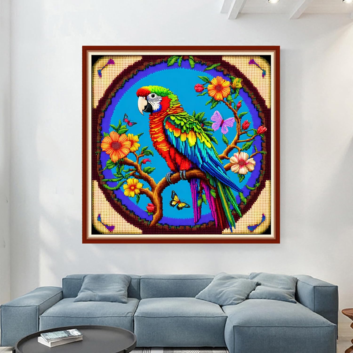 Dimensean Stamped Cross Stitch Kits Full Range of Embroidery Patterns Starter Kits for Beginners Adult or Kids DIY Cross Stitches Needlepoint Kits 11CT-Parrot Flower17.7x17.7 inch