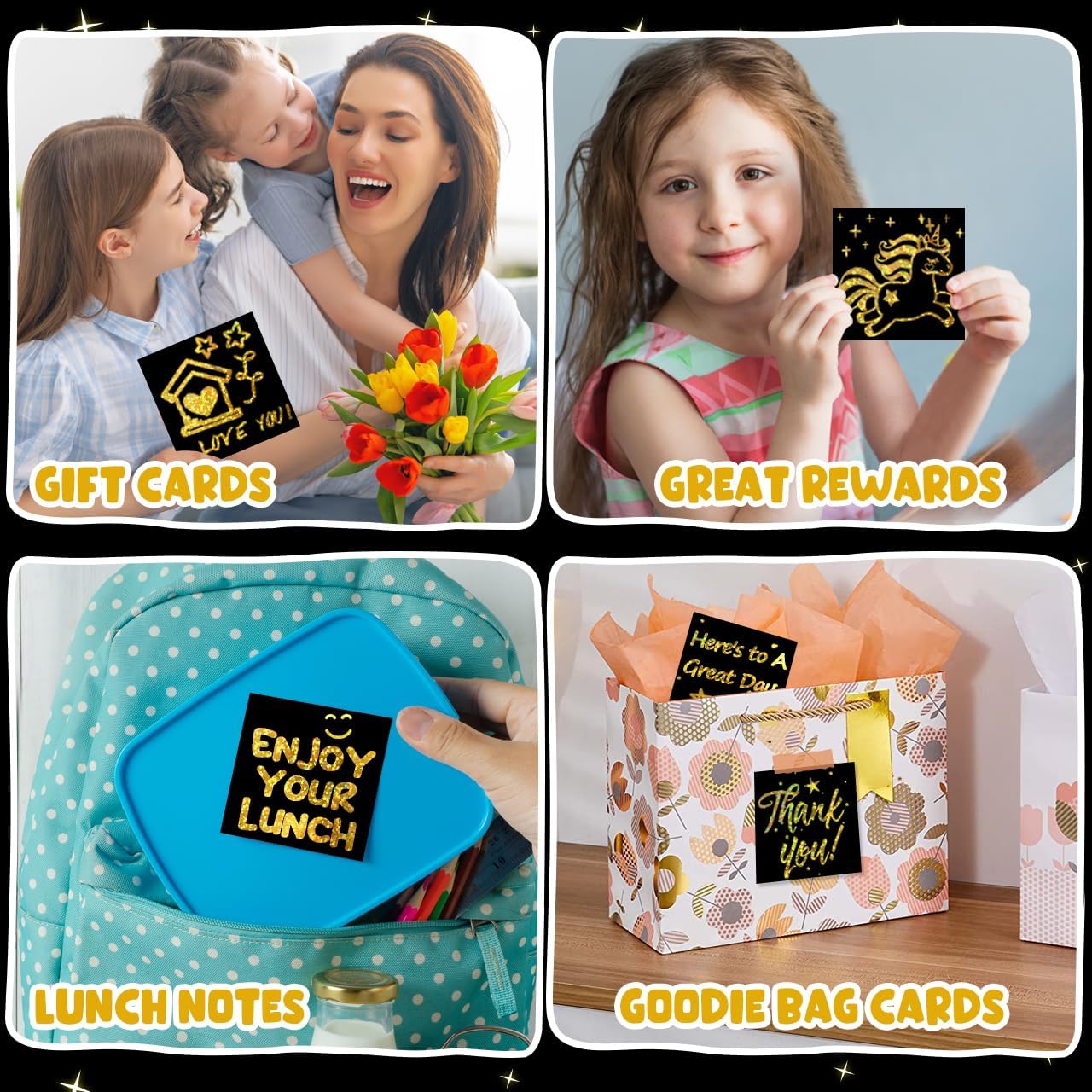 - Create Sparkling & Amazing Artwork: The scratch paper art notes is covered with glitter holographic gold layer. Just scratch away the black matte surface and the holographic materials will flash dazzling colors and luster at different angles under the sun or light. This black scratch off paper let kids take the time to play, think, and create their inconceivable masterpieces