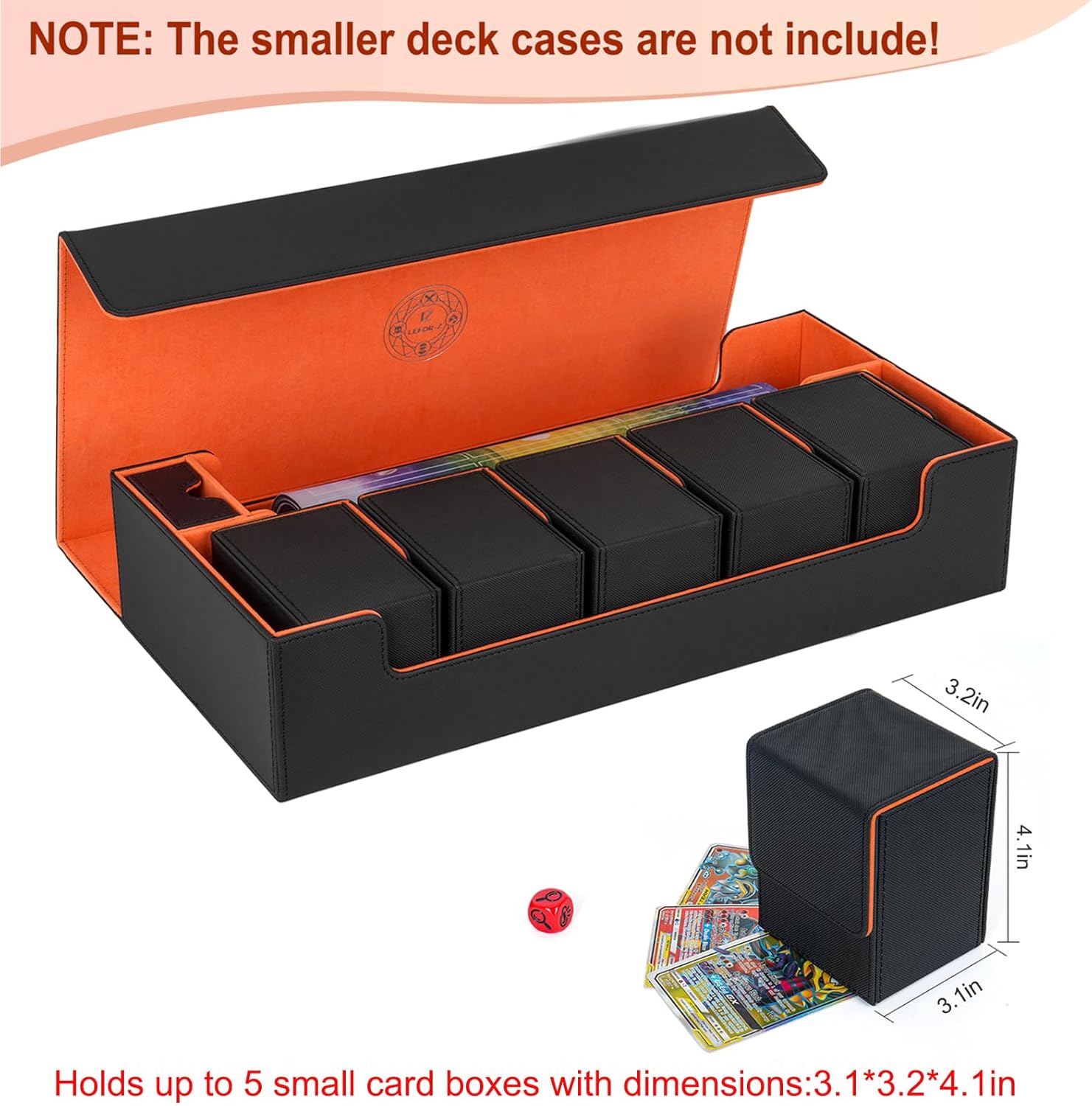 Card Deck Box,X-Large Premium Trading Card Storage Case with Mat and Dice Compartment,Magnetic Game Deck Display Case Compatible with MTG/TCG/Yugioh/Magic/Commander(Black&Orange)