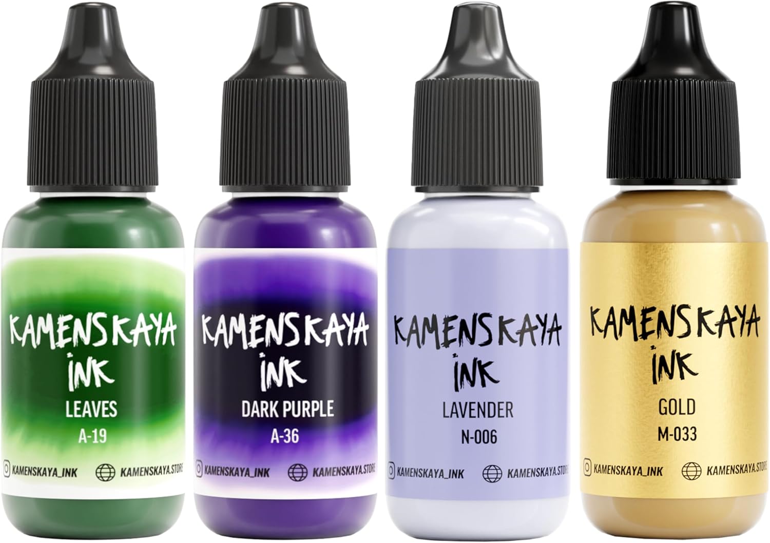 - SET COMPOSITION: 4 inks 0.51 fl oz (15 ml) each. 2 inks of basic ‘A’ line (light translucent texture, saturated color and a nice satin finish), 1 gold metallic alcohol ink (natural metallic pigment ink to create golden facets and light cobwebs in your ink art work) and 1 pastel alcohol ink (delicate pastel shade with velvety finish based on dye and pigment, where the pigment provides a dense and opaque layer, while the dye is responsible for the color)