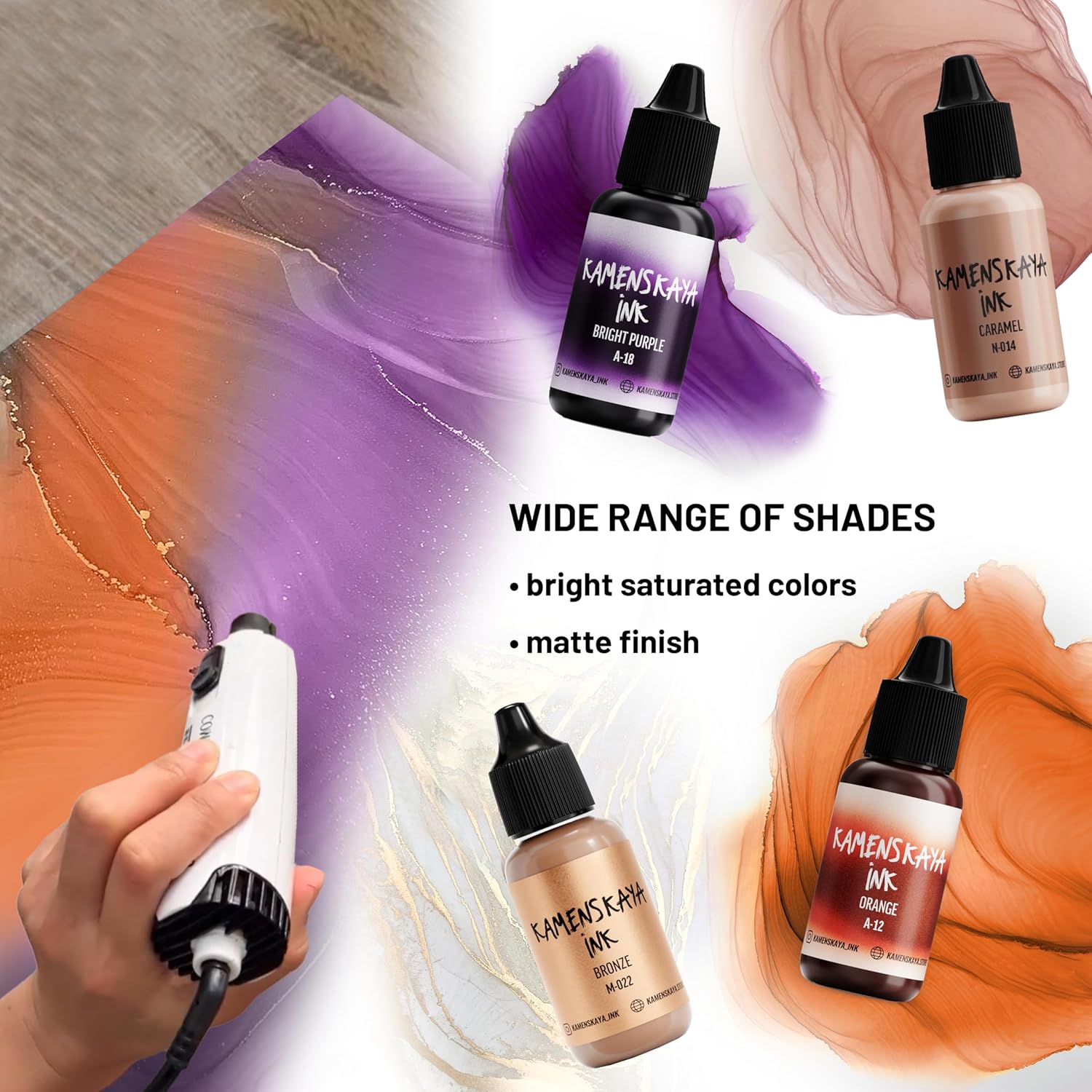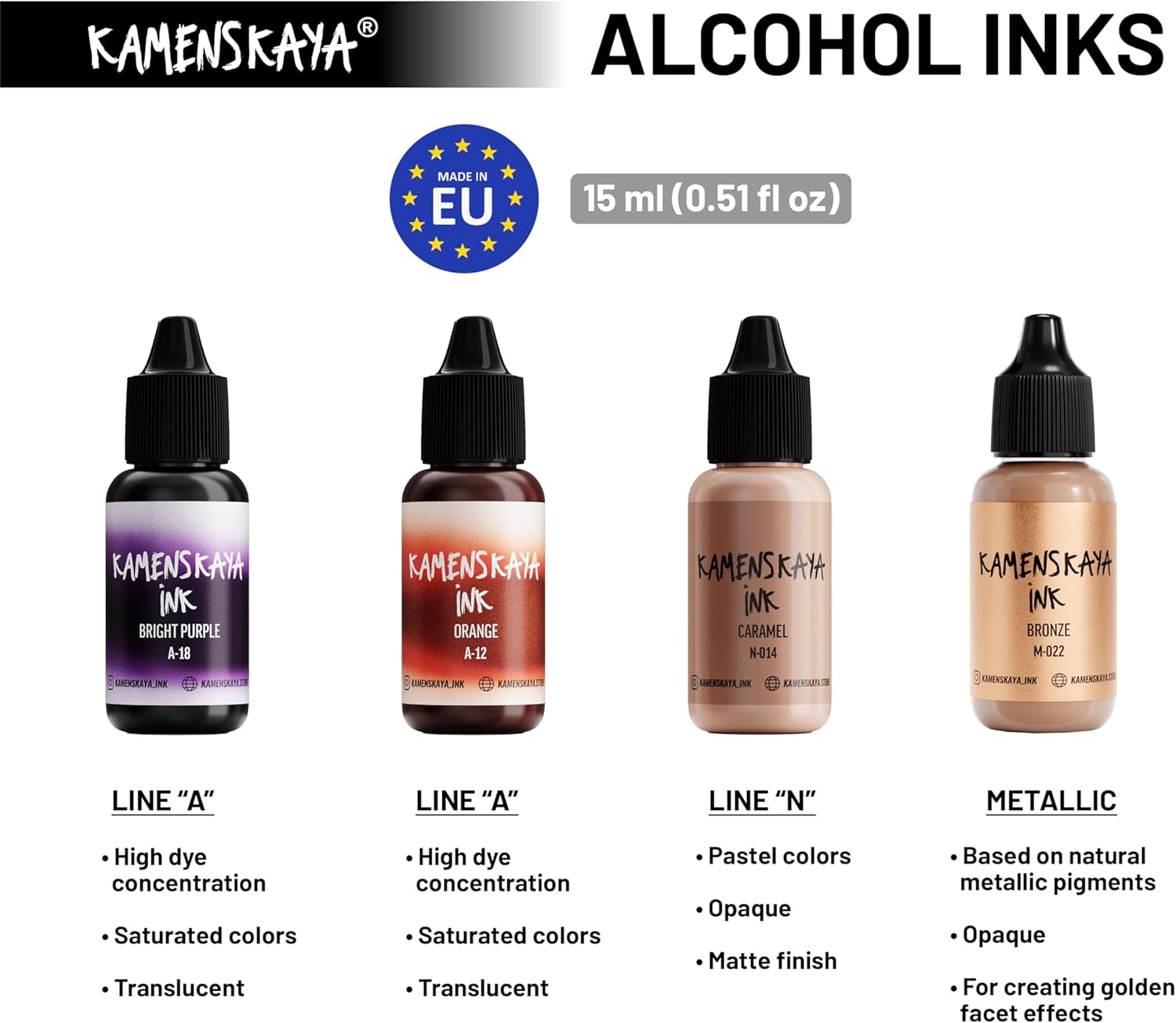 - Set composition: 4 inks 0.51 fl oz (15 ml) each. 2 inks of basic ‘A’ line (light translucent texture, saturated color and a nice satin finish), 1 bronze metallic alcohol ink (natural metallic pigment ink to create golden facets and light cobwebs in your ink art work) and 1 pastel alcohol ink (delicate pastel shade with velvety finish based on dye and pigment, where the pigment provides a dense and opaque layer, while the dye is responsible for the color)