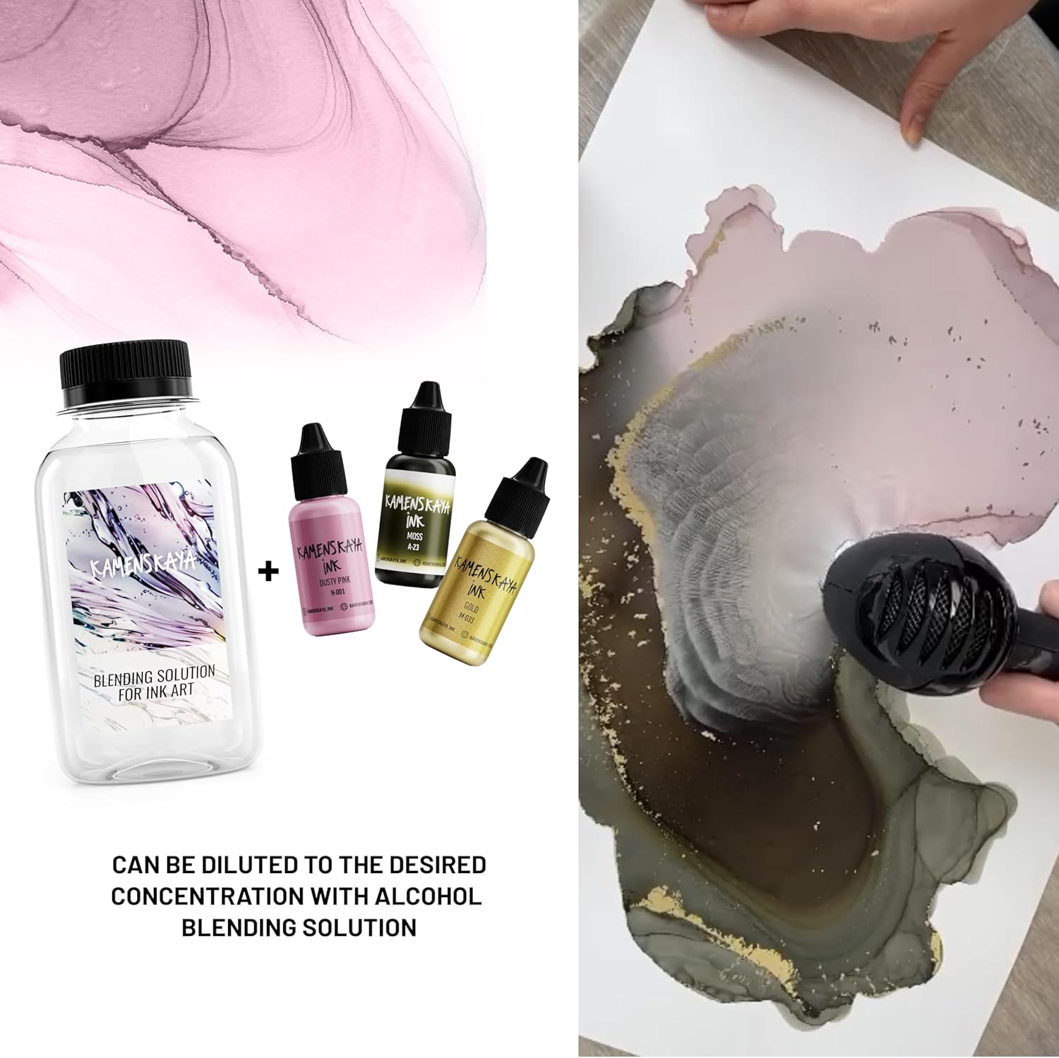 - Mix colors easily with each other and dilute to the desired concentration with KAMENSKAYA special alcohol blending solution