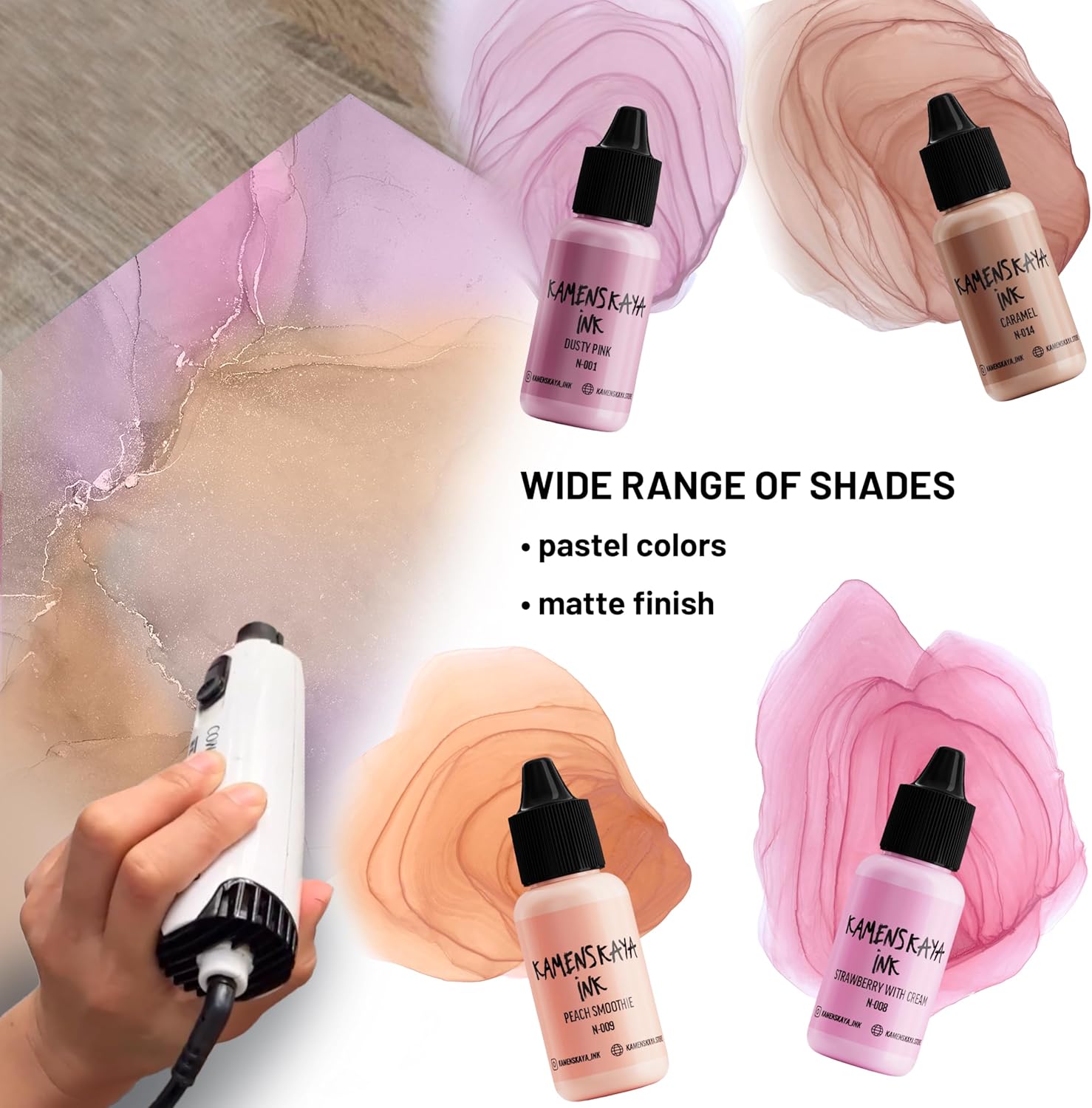 - Set composition: 4 inks 0.51 fl oz (15 ml) each of pastel alcohol ink (delicate pastel shade with velvety finish based on dye and pigment, where the pigment provides a dense and opaque layer, while the dye is responsible for the color)