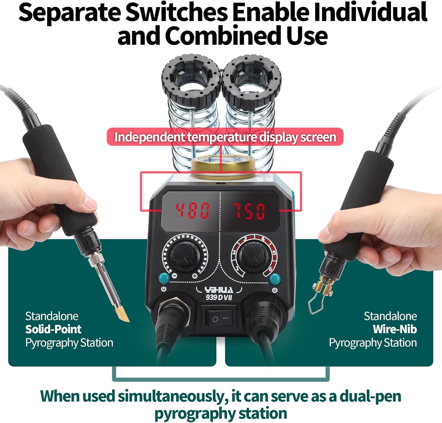 YIHUA 939D-VII Pyrography Tool Wood Burning Pen Kit Station 2-in-1 Solid-Point 200~480°C (with Temp Display)/Wire-Nib 250~750°C with 23 Nibs, 50 Solid Points, 6 Woodpieces