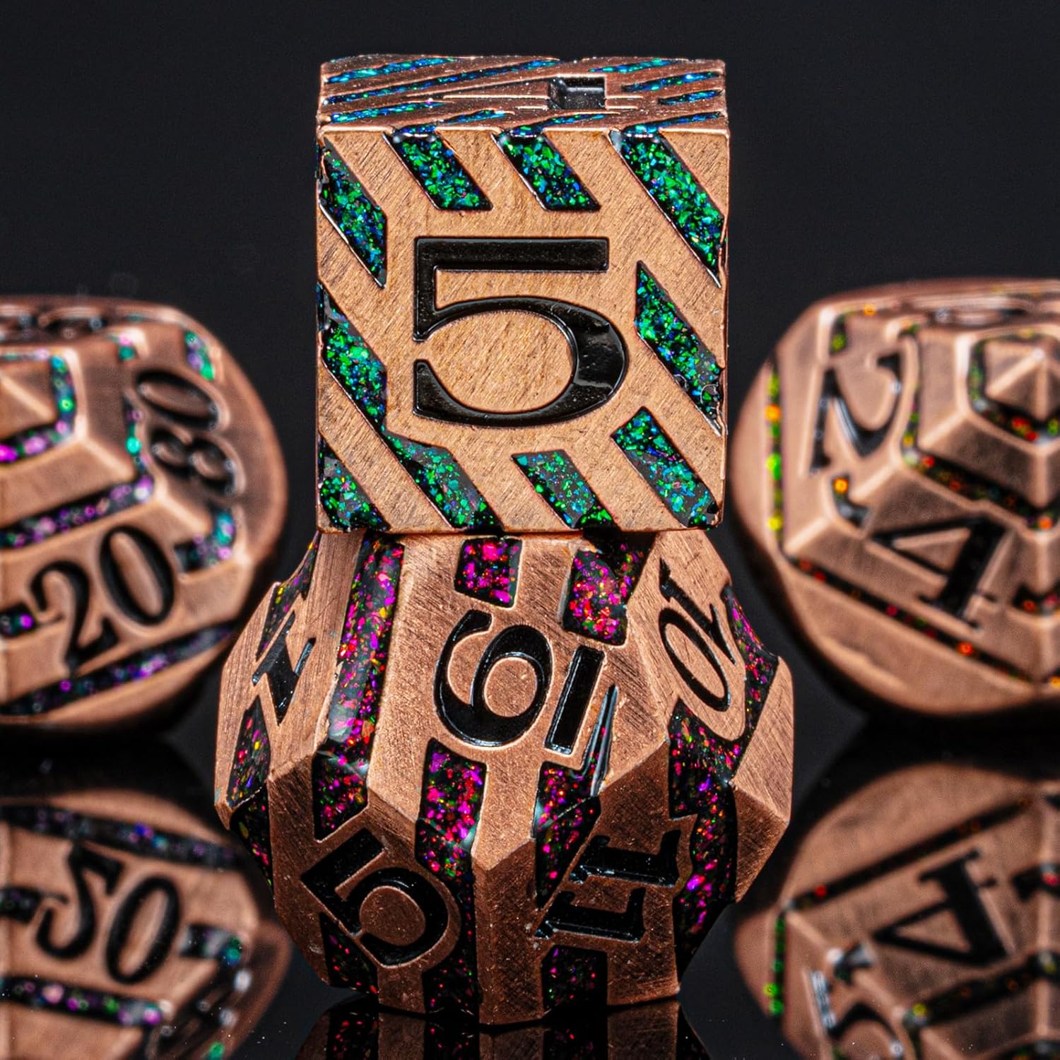 Metallic Glitter Stripes D&D,DND Metal Dice,7pcs Polyhedral Dice Set with Gift Case for D&D Tabletop Game (Antique Red Copper Seven Colors)