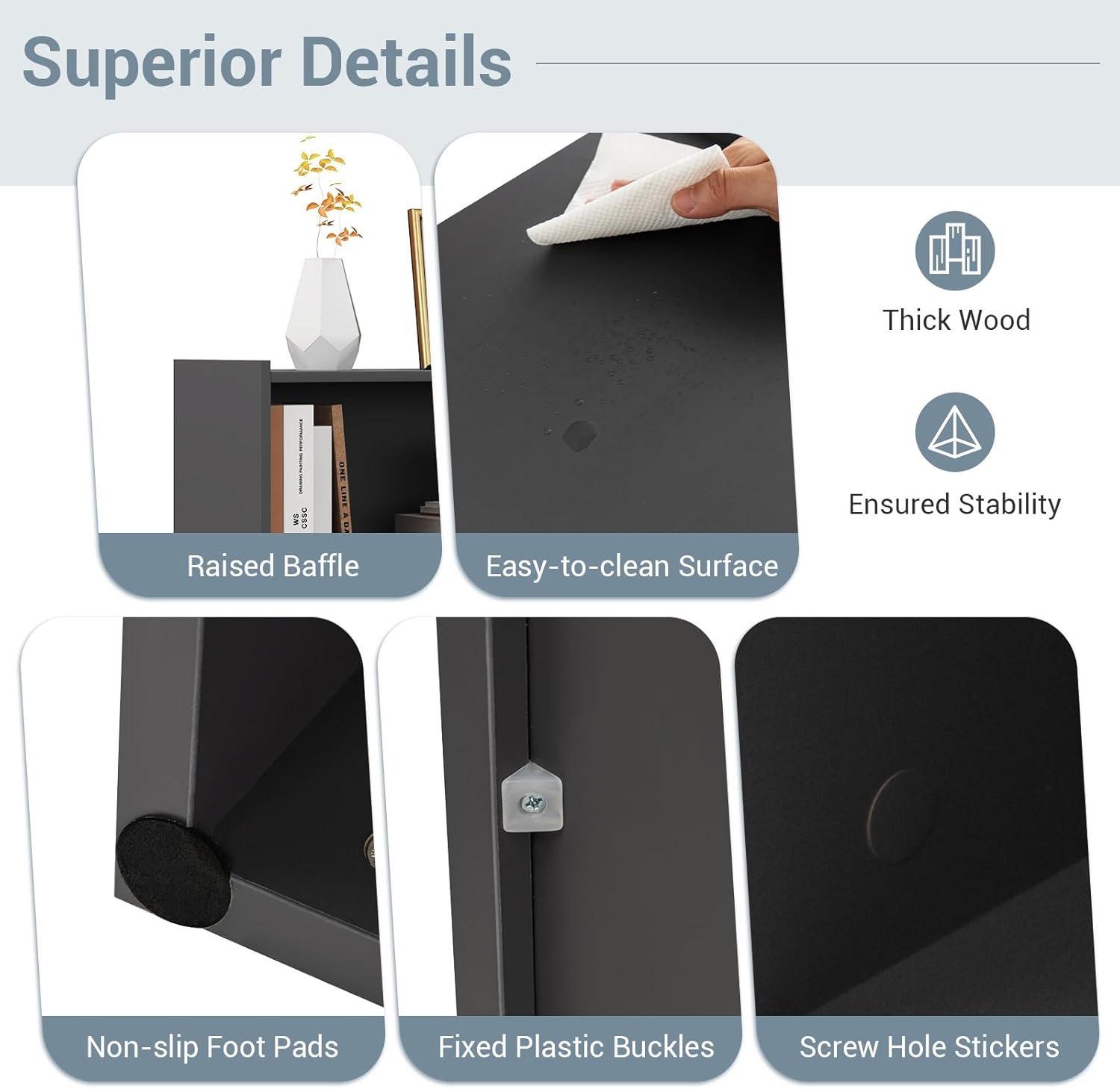 - Thoughtful Detail Design: The bookcase has non-slip feet on the bottom to protect the floor from scratches, and the base is 4 inches high thus blocking stains from the floor. In addition, the edges and corners of the horizontal cabinet are rounded to protect you and your family.