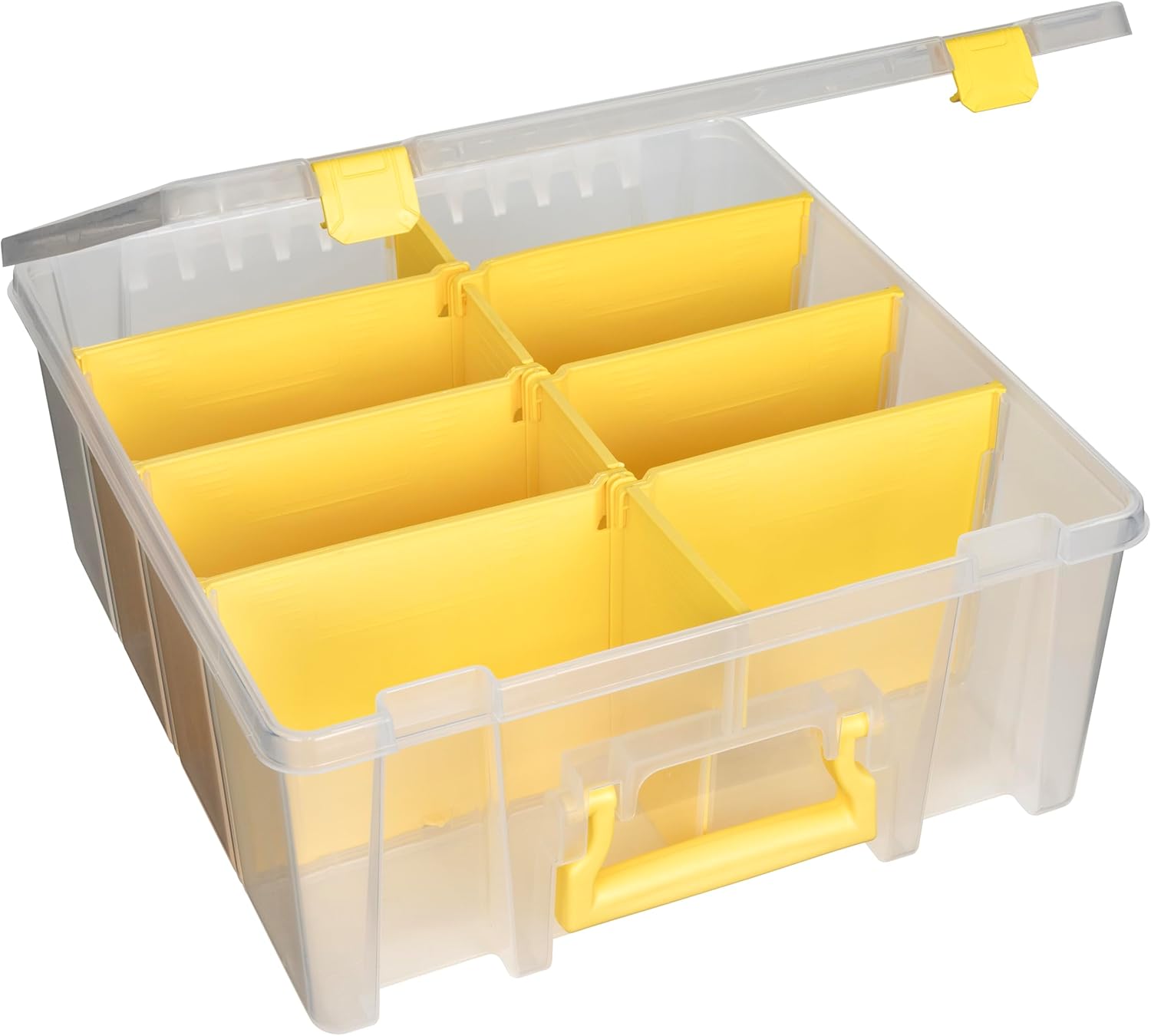 - Portable Art Storage Box with 2 to 8 removable, double-deep compartments for organized storage of art and craft supplies.
