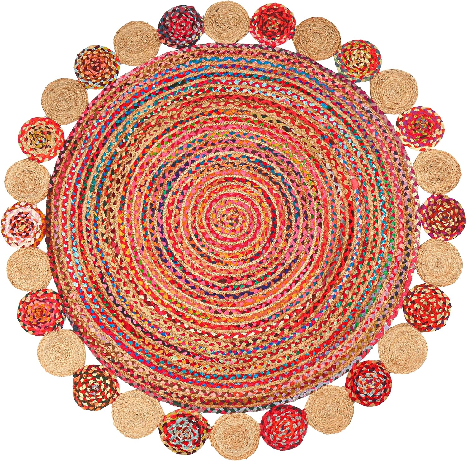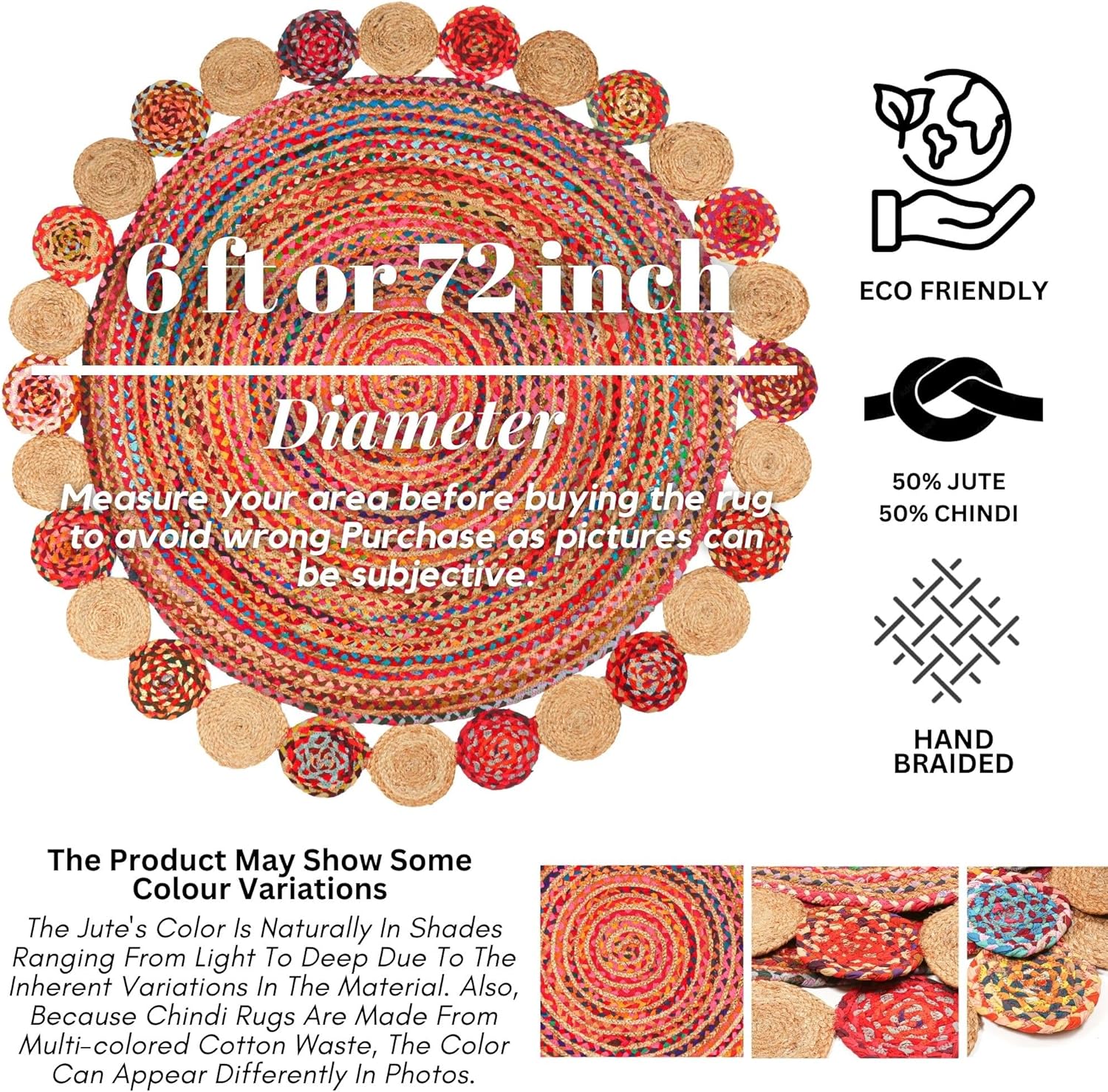 6' Round Handwoven Jute Chindi Area Rug - Colorful Boho Rugs for Living Room - Hand Braided Multicolor Bohemian Rug for Farmhouse, Bedroom, Dining Room, Classroom, Hallway, Kitchen, Office