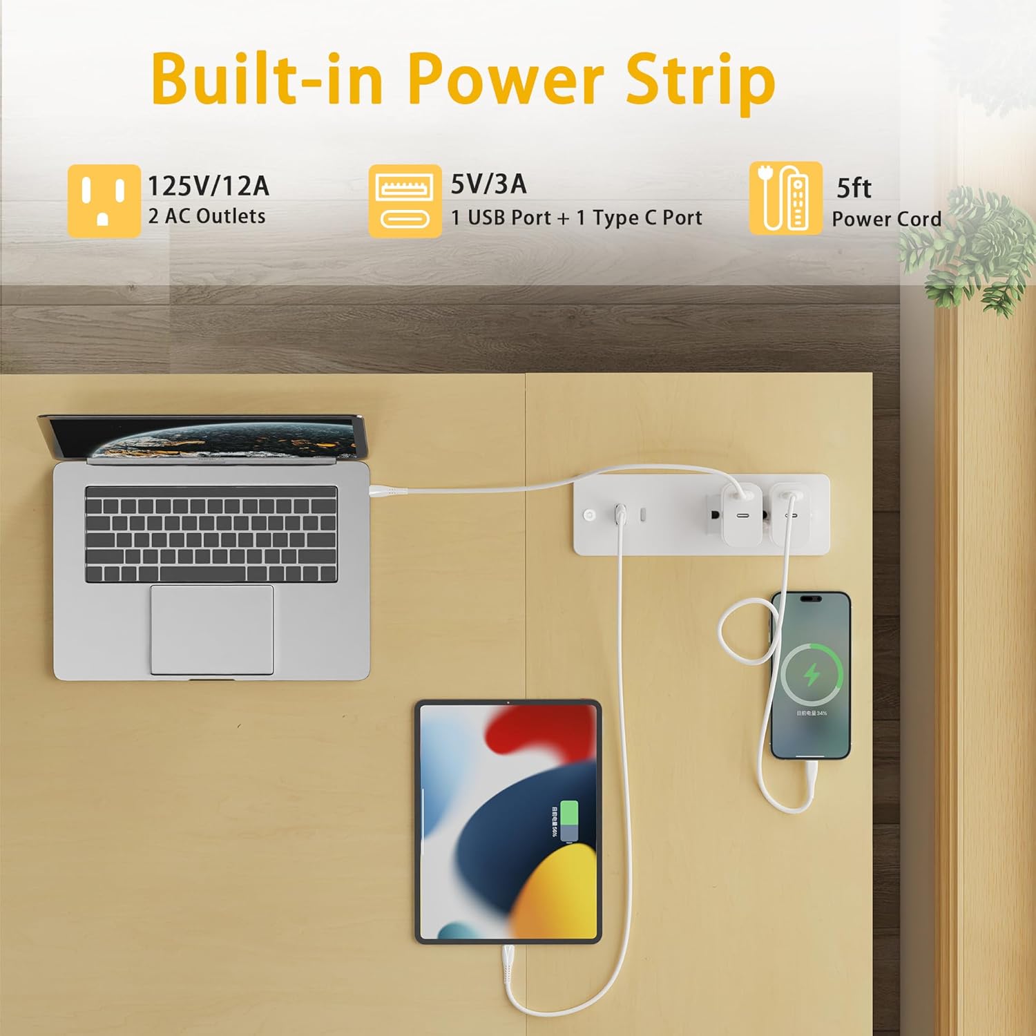 - [L Shape Desk with Power Outlets] The l desk has built-in power outlets featuring two AC outlets, one USB port, and one Type-C port, simplifying charging and cutting down on cable clutter.