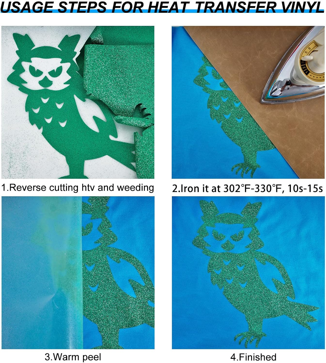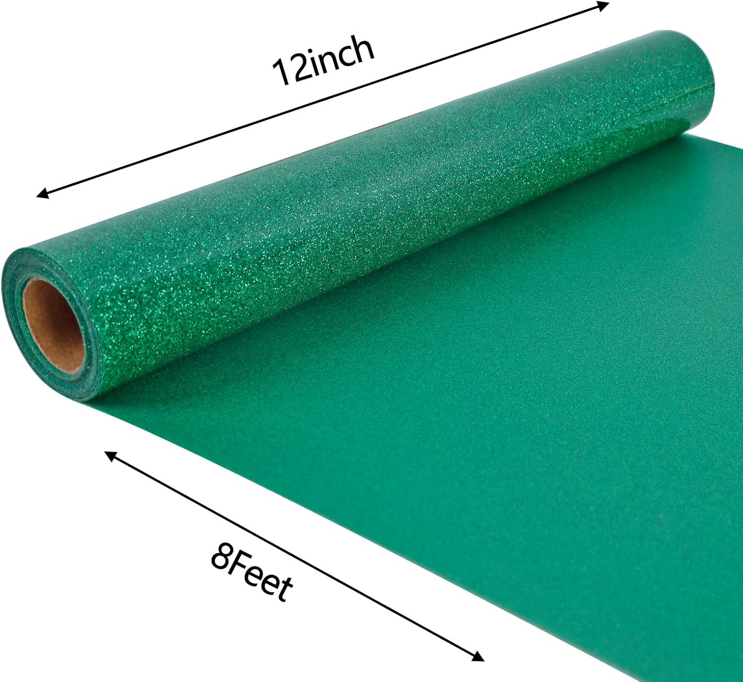 - EASY TO CUT & WEED & TRANSFER: Our green glitter HTV Vinyl rolls is sensitive to temperature and pressure, which can be quickly and easily to weed and peel. It is compatible with all cutter machines, most heat presses and household irons on the market, and perfect for 12x12" and 12x24" cutting mats. You can easily apply adhesive backing HTV to fabric using a hot iron or hot press. Please note that it is warm peel