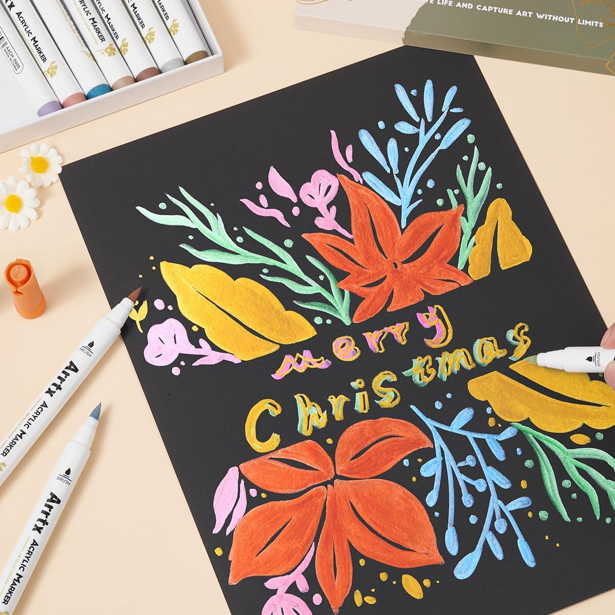 - Work Well on Diverse Surface: Arrtx acrylic markers set provides water-based smooth ink and excellent coverage for a variety of surfaces, works for paper, cardstock, metal, rock painting, wood, plastic, canvas, fabric, stone, Easter eggs, easter decoration, metal, Christmas ornament, Halloween pumpkin painting, calligraphy, scrapbook, brush lettering, Christmas card, birthday, greeting card, or any DIY crafts projects and more. Let's express imagination!