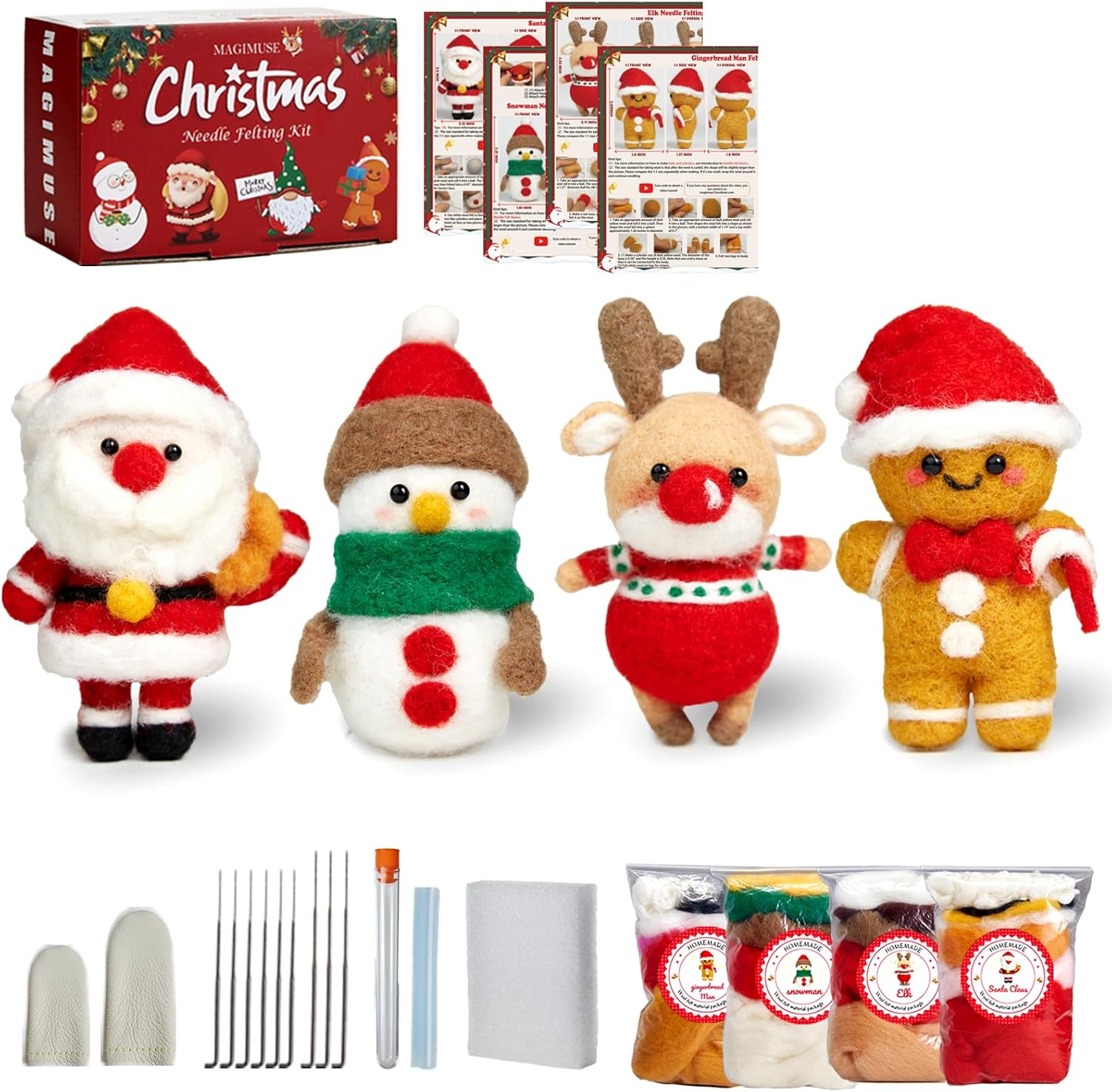 - 🎅Christmas Wool Felt Kit: MAGIMUSE Christmas Needle felting kits come with a colorful box, includes 4pcs Christmas making material bag (20% more wool per color), 9pcs felting needles, 3 pcs instructions(basic tutorial & step-by-step video instructions), colorful handle, fingercot, foam mat, eyes. Our needle felting kit with video instruction, please kindly refer to the paper instruction comes with our needle felting starter kit. Can be a lovely product set for your mom, kid, friends.