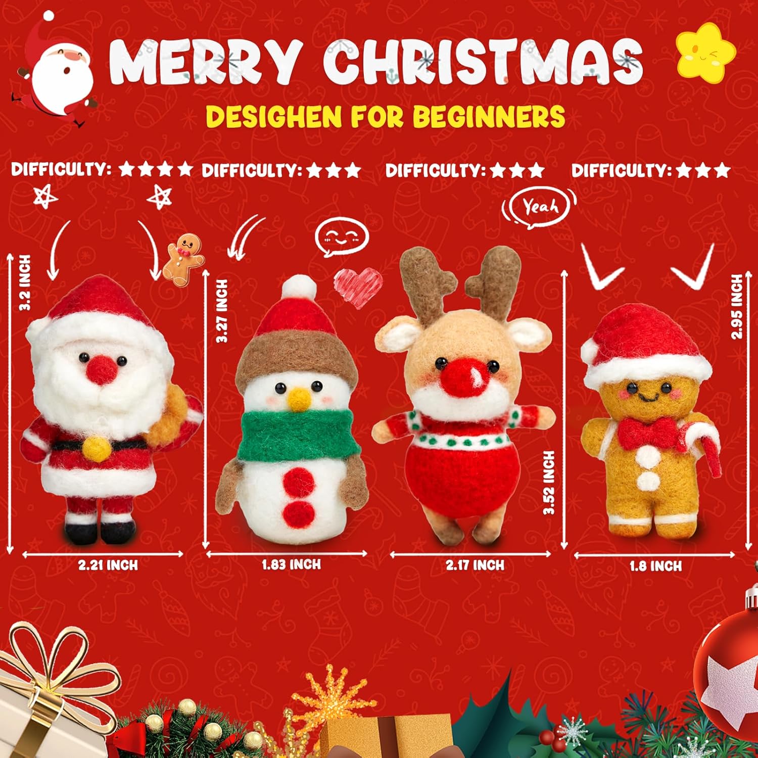 - 🎁Perfect Christmas gift: Merry Christmas! Our Christmas Needle Felt Starter Kit includes a variety of Christmas characters (Santa Claus, Christmas Deer, Snowman, Cookie Man) suitable for all ages and makes a great gift for anyone interested in crafting. Make these plush toys and share them with your family, friends and loved ones. This is a great gift for Halloween, birthdays, Christmas, Thanksgiving, New Year, Valentine's Day or other holidays.