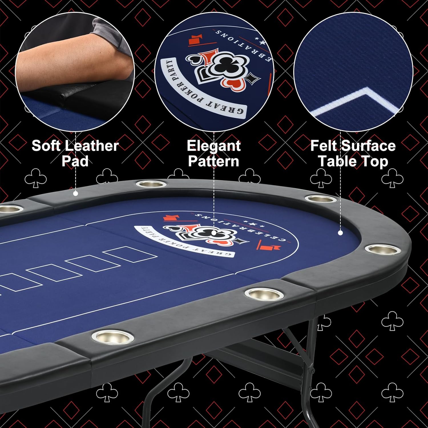- Felt Surface & Padded Armrest:Our gaming table features a delicate and soft casino-grade blue felt wool surface, offering a superior gaming experience with reduced chip-dropping noise. Moreover, the table's edge has soft rails, It allows players to rest their arms comfortably while playing. The elegant pattern is printed on the poker tabletop, and it adds a touch of classiness to your card game.