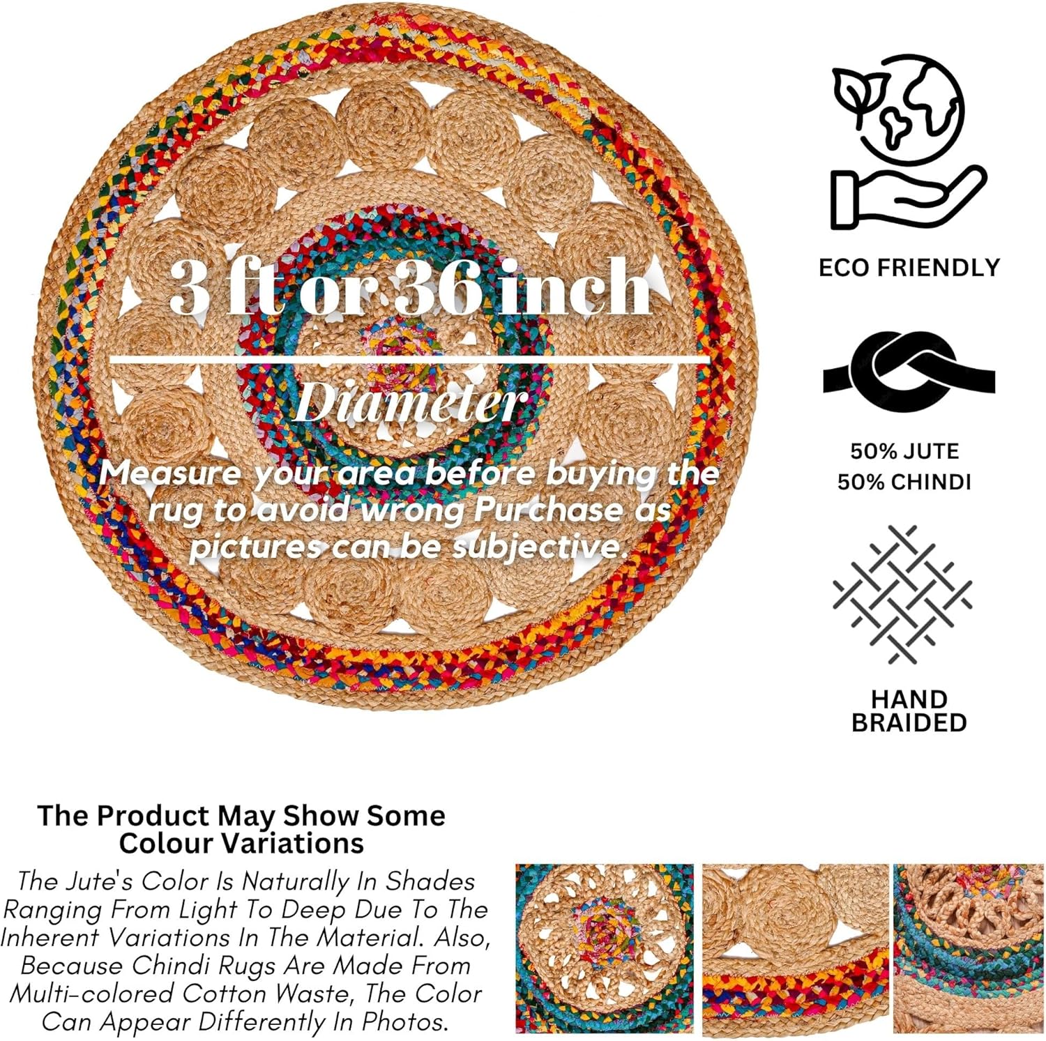 3' Round Handwoven Jute Chindi Area Rug - Colorful Boho Rugs for Living Room - Hand Braided Multicolor Bohemian Rug for Farmhouse, Bedroom, Dining Room, Classroom, Hallway, Kitchen, Office