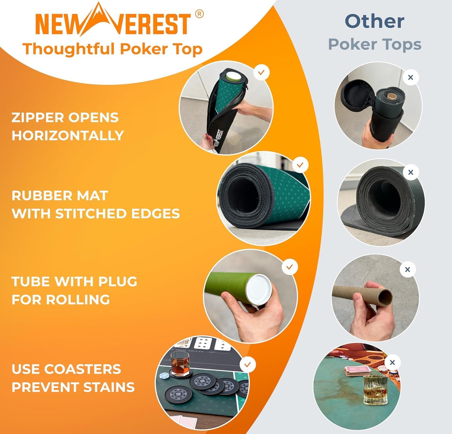 Newverest Poker Table Top 70" x 35", Texas Hold'em Poker Mat for Home Game Nights Up to 10 Players, Blackjack, Casino | Poker Topper for Tables in Zipper Storage Bag with 8 Coasters in Gift-Ready Box