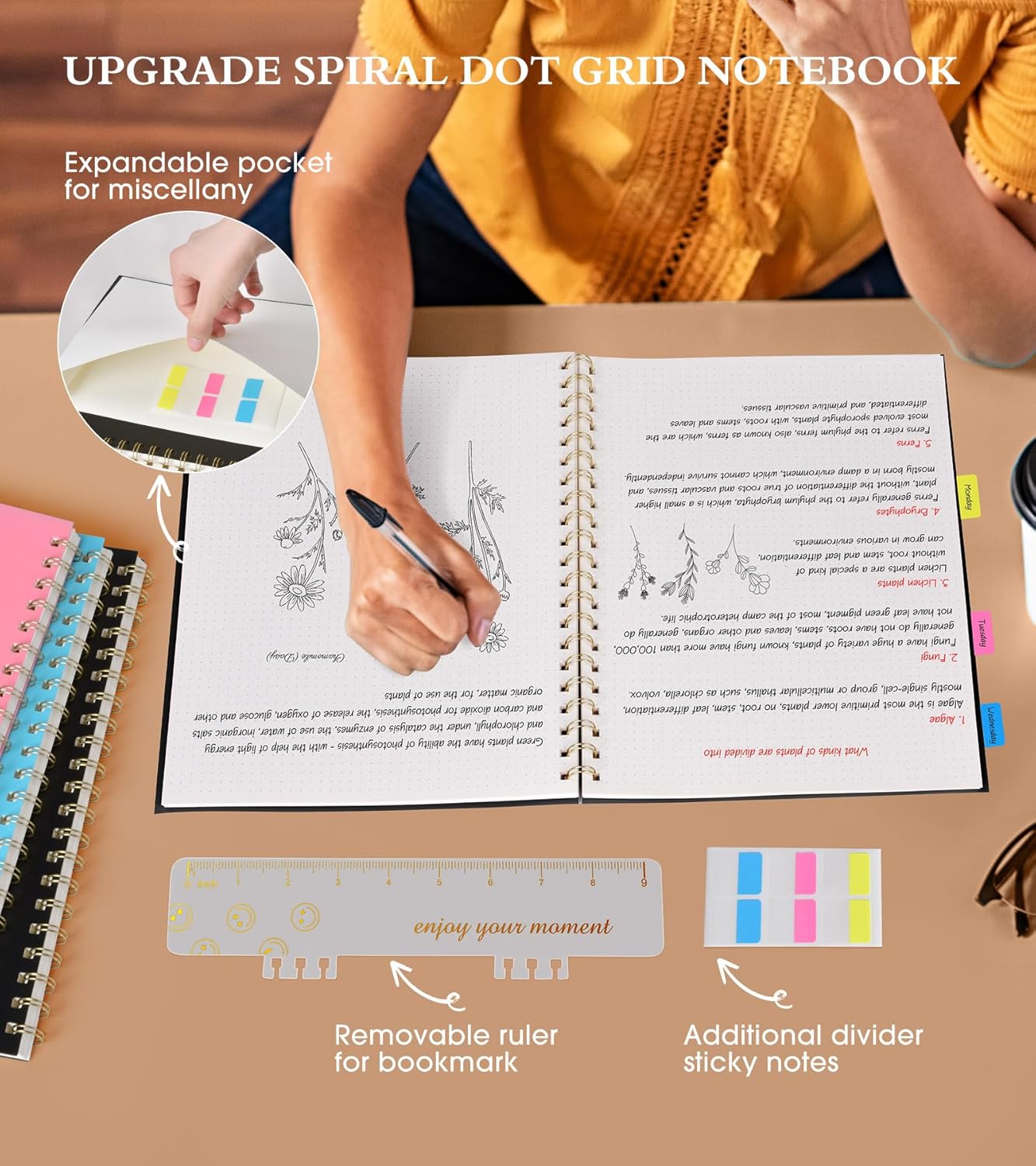- 【Strong Spiral Metal Twin-Wire】 Our spiral dot grid journal notebook has a sturdy gold-color double wire spiral with easy-to-turn pages and keeps pages attached reliably, while still staying flat when opened, which reading more convenient and taking notes more efficient. Spiral dotted notebook easy to tear-off and fold over, as well as flip the cover back, giving you a better writing experience. Golden spiral bound adds aesthetic matching, it’s the perfect big notebook for journaling.