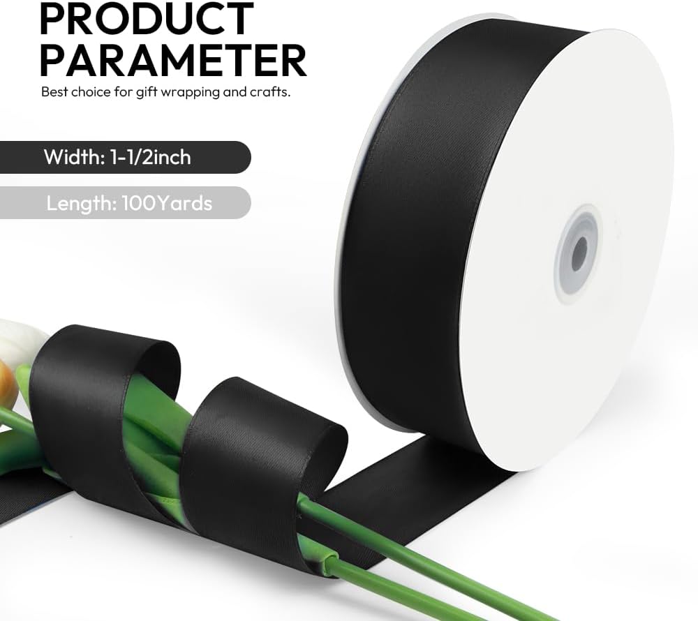 1-1/2 Inch 100 Yards Satin Ribbon Black, Solid Color Fabric Ribbon for Gift Wrapping, Wedding, Polyester Gift Ribbon for Birthday Party Decoration, Craft, Hair, Floral, Sewing