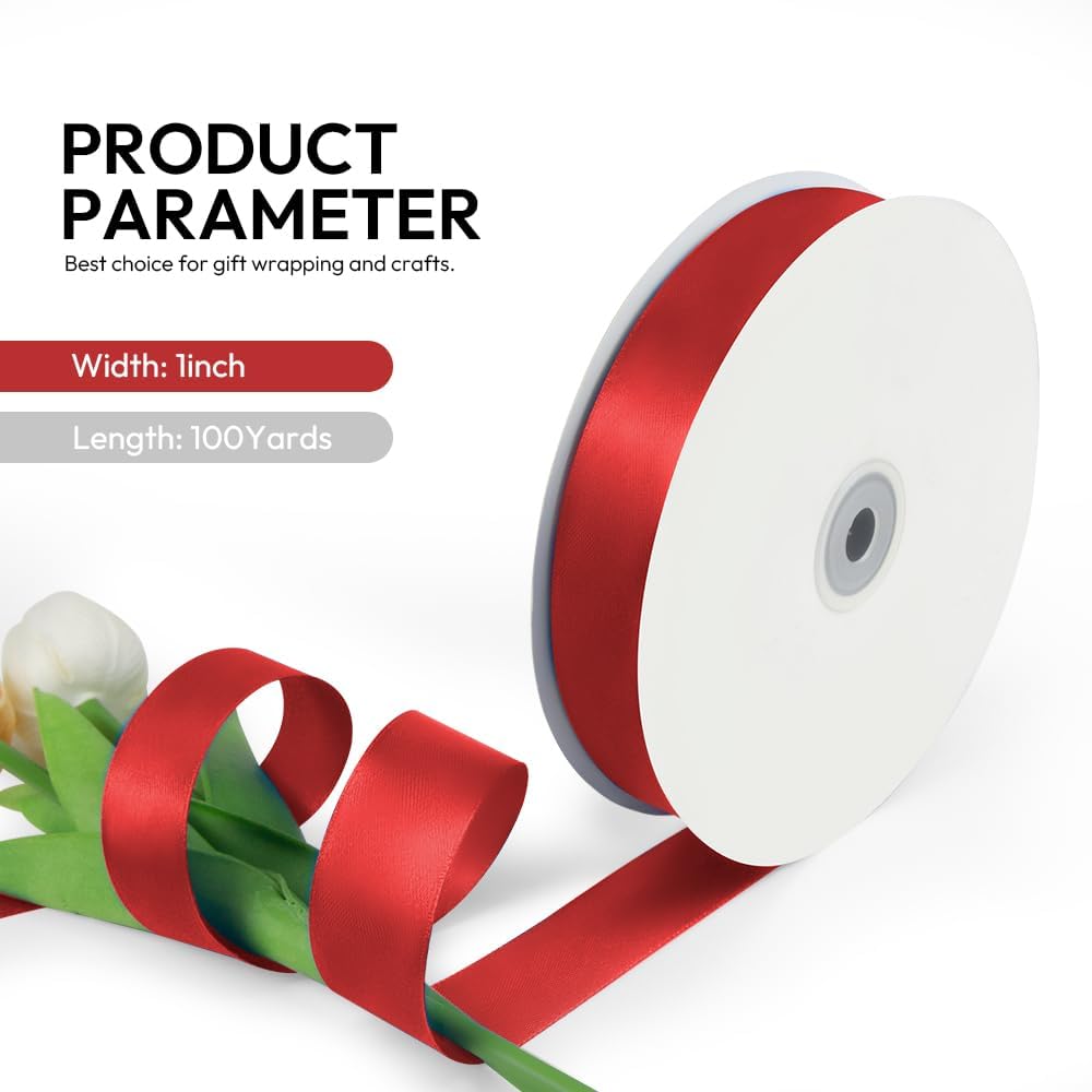 1 Inch 100 Yards Satin Ribbon Red, Solid Color Fabric Ribbon for Gift Wrapping, Wedding, Polyester Gift Ribbon for Birthday Party Decoration, Craft, Hair, Floral, Sewing