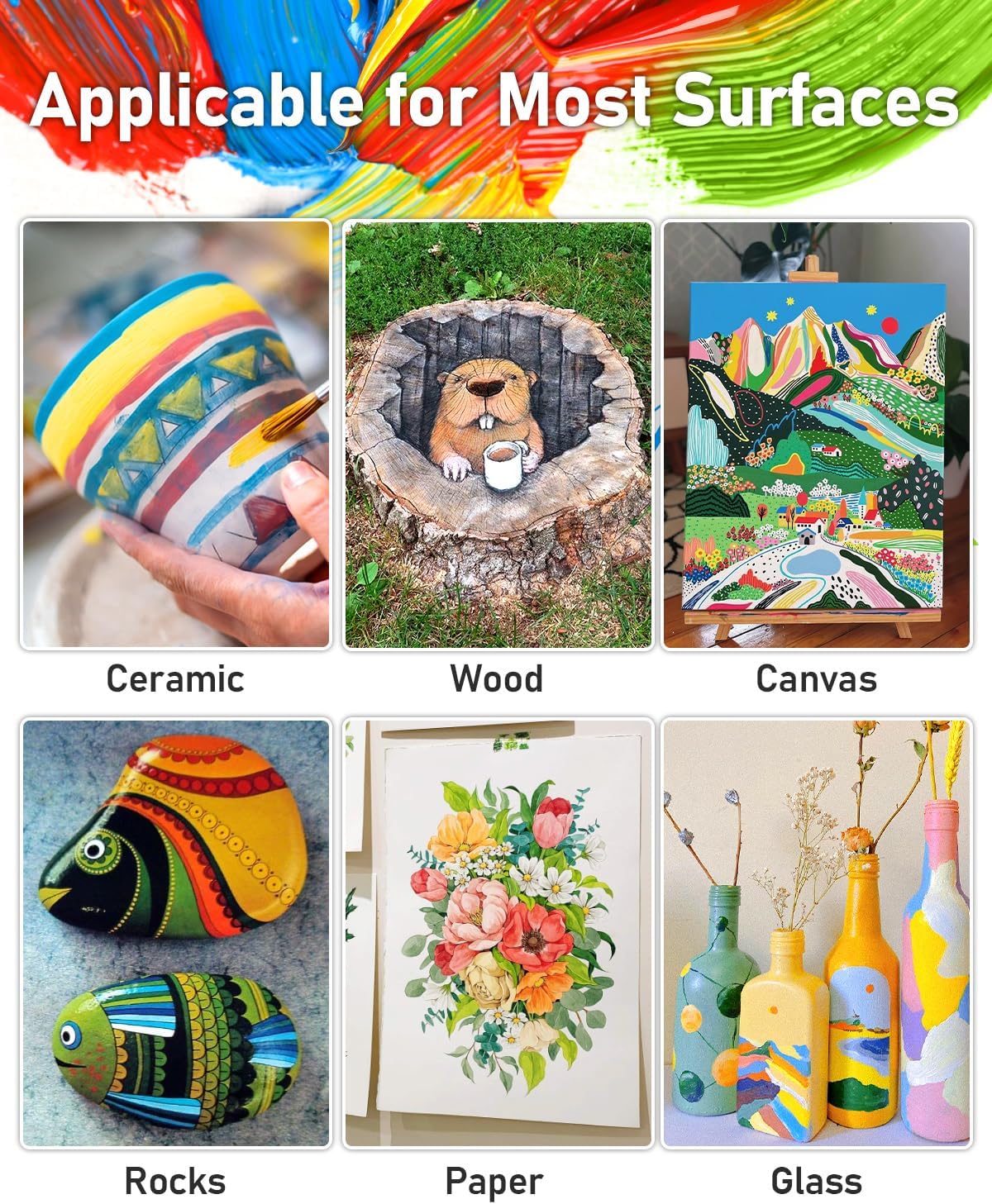 - Wide Application - The versatile acrylic paint can be applied to most surfaces like ceramic, wood, rocks, canvas, fabric, glass, paper, chalk board, etc. Great for artists, beginners, kids & adults, school, classroom or paint party. It also works well with pouring oil for pouring painting