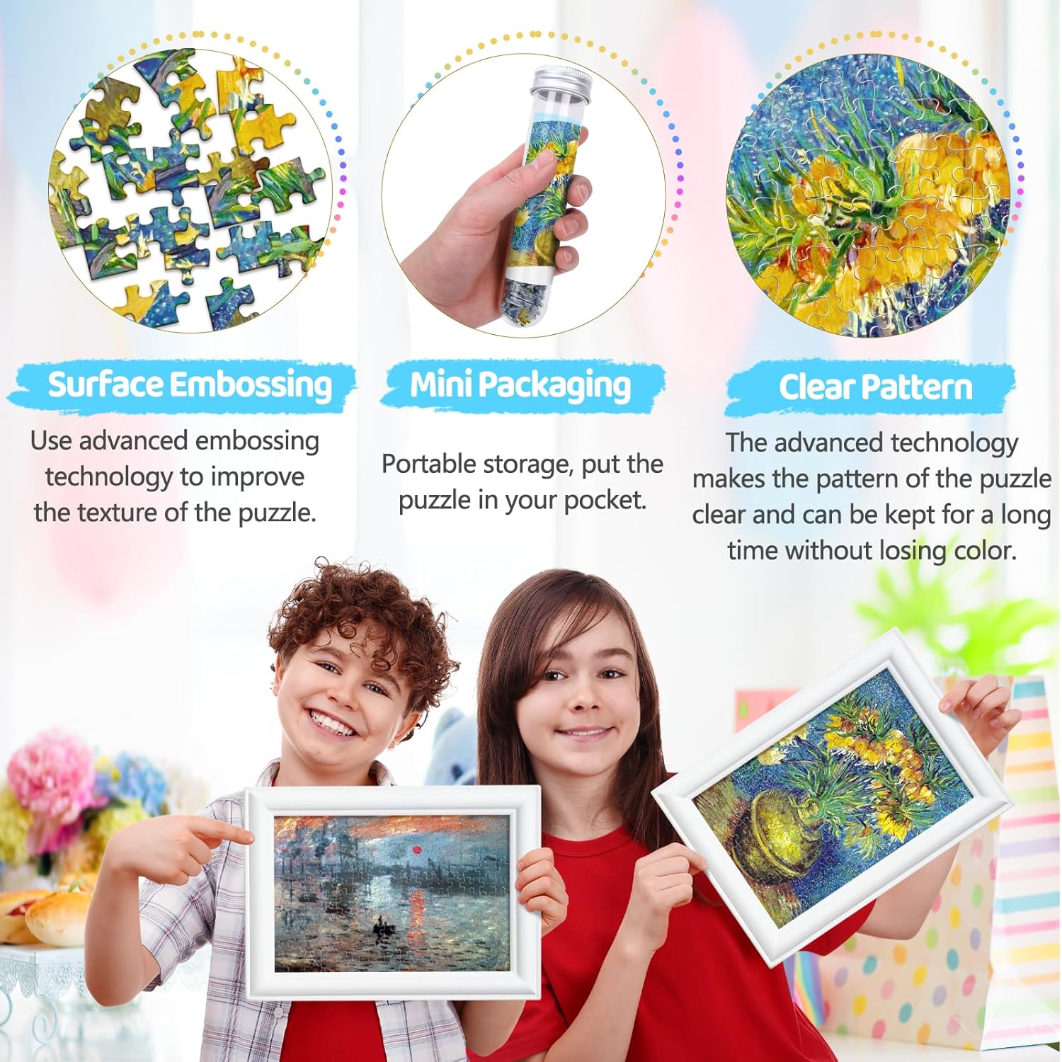 - PACKAGE INCLUDE: 3 PACKS mini jigsaw puzzles (impression sunrise, fritillaries in a copper vase, cafe terrace at night), 1 pack contains 150 PIECES. FINISHED SIZE: 6 x 4 inches / 15 x 10 cm.
