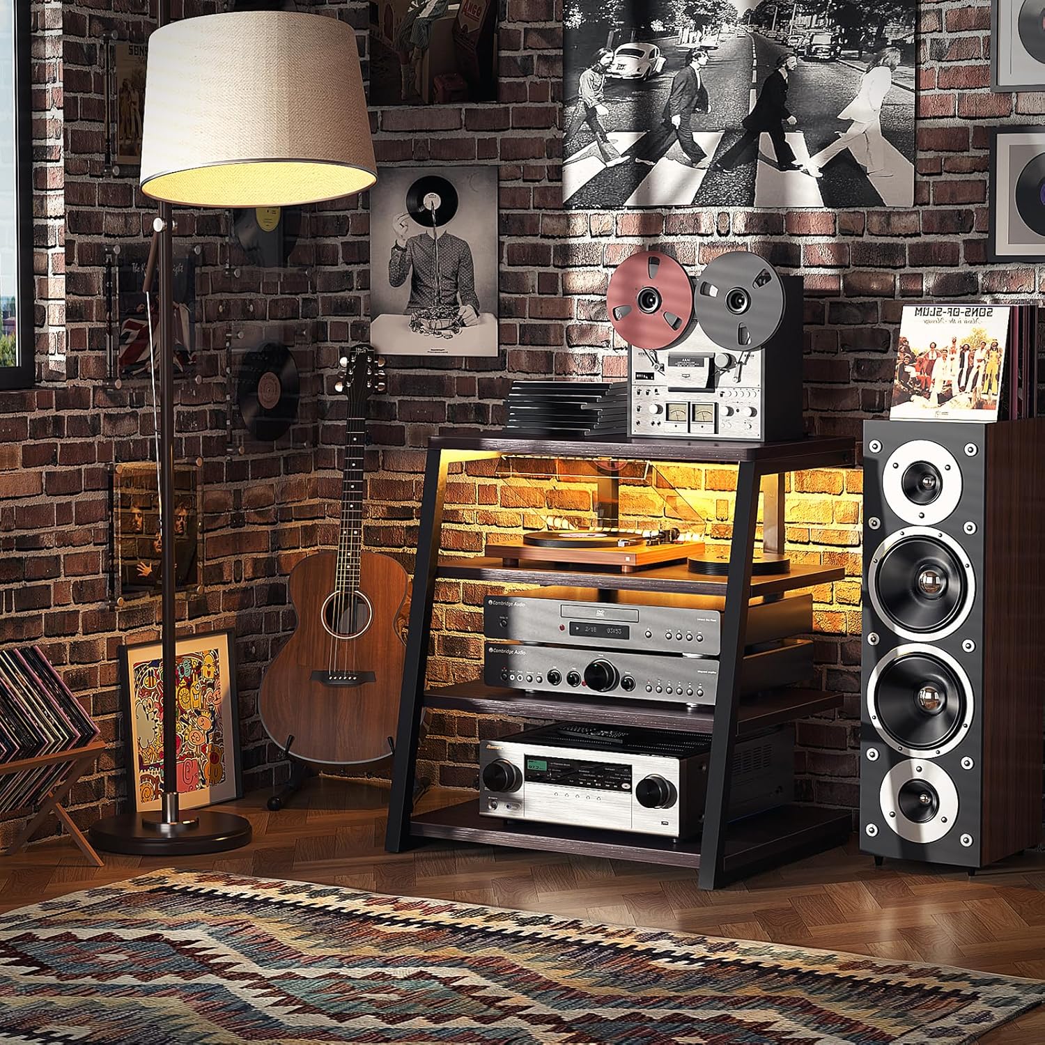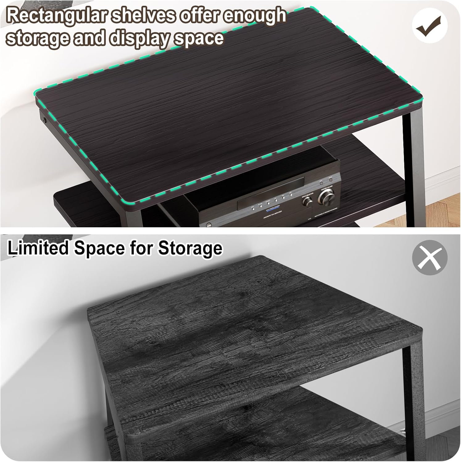 - Large Accommodation - 23.6'' wide shelf boards that this media stand has offer you enough space to place your stereo equipment. The open construction and 4-tier adjustable shelves will make your setup easier and more convenient. The open construction also means that your electronics aren't going to overheat, because air is circulating freely all the time. Plenty of clearance for gaming consoles, DVD players, a cable box, a sound system woofer, and a CD changer.