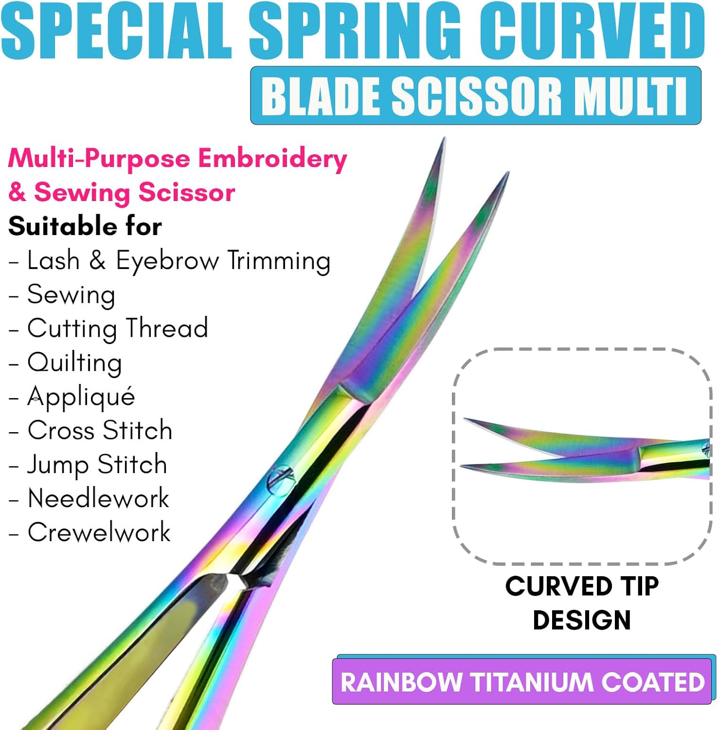 Cross Edge Curved Spring Scissors 5 Inch Stainless Steel Precision Eyebrow & Eyelash Shaping & Trimming Scissor, Snips Squeeze, Embroidery, Knitting Micro Tip Craft Scissors (Rainbow)