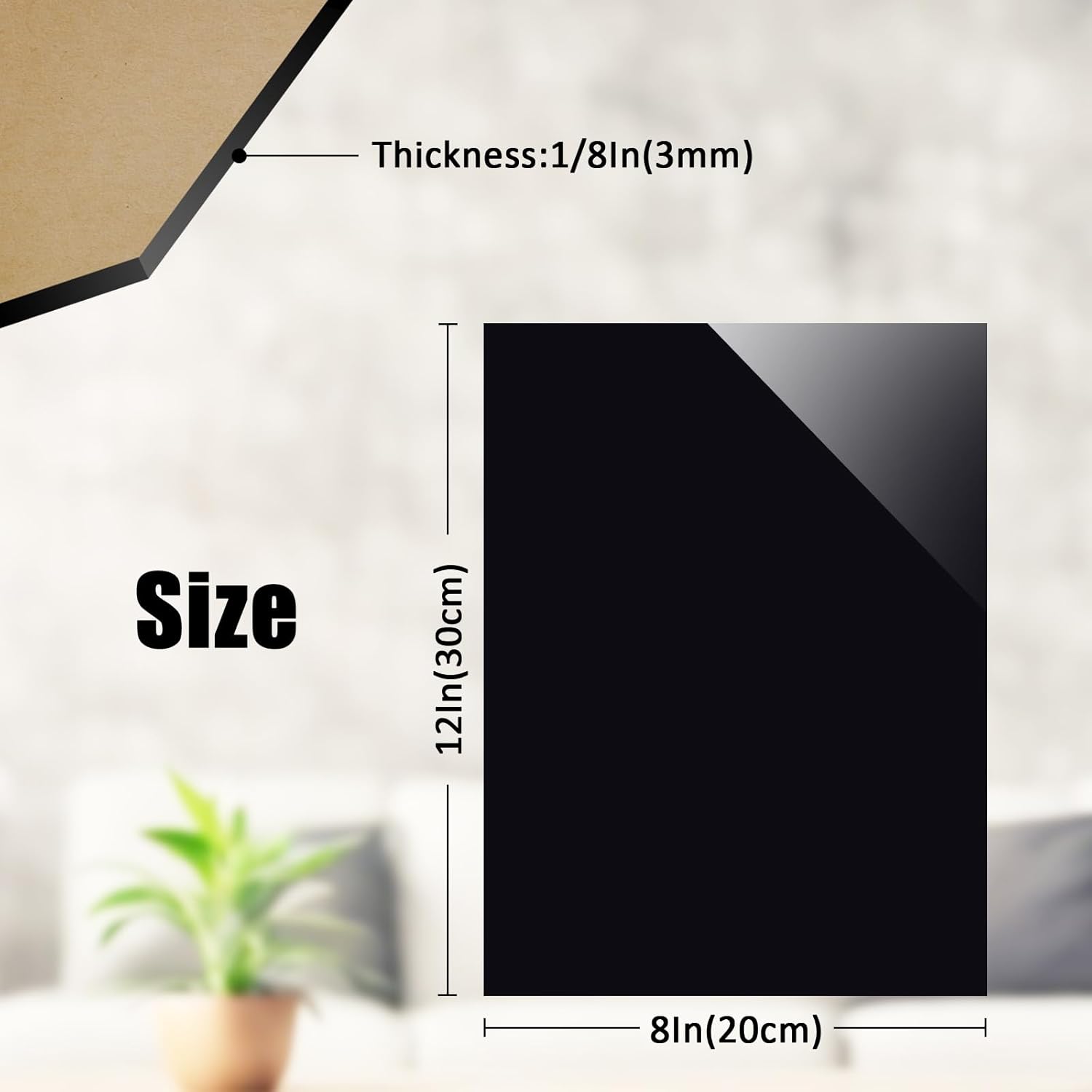 - Thickness: The thickness of these black acrylic sheets is 1/8 inch (or 3mm). This thickness provides strength and durability while maintaining flexibility for easy handling and manipulation during crafting processes.
