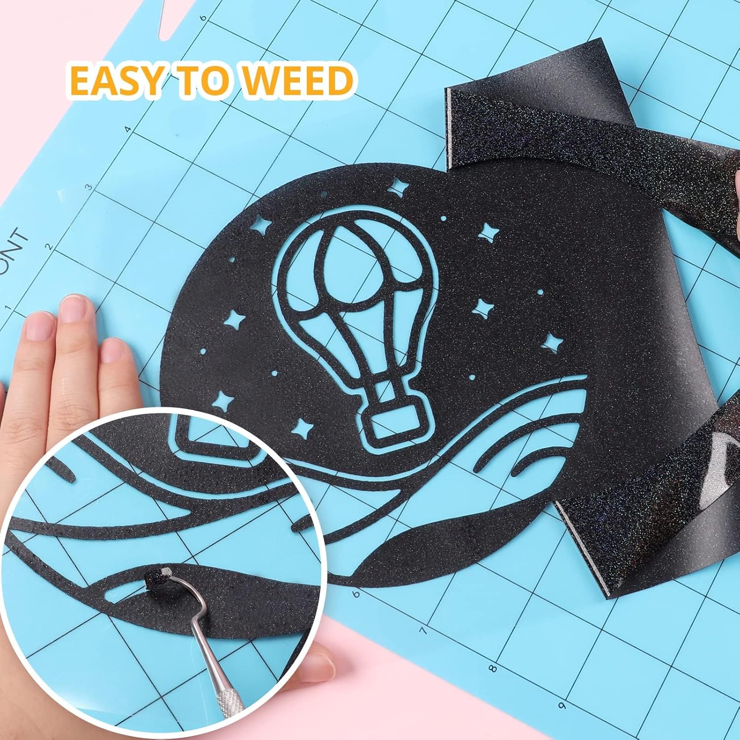 - 【Sparkle & No Residue】Our Black glitter htv vinyl rolls are specially processed to give your designs a shinier look. Additionally, all of our glitters are embedded in vinyl and won't leave residues when weeding and won't fall from your project. Novices or professionals, big or small projects, this Black glitter iron on vinyl roll is a great choice for you!