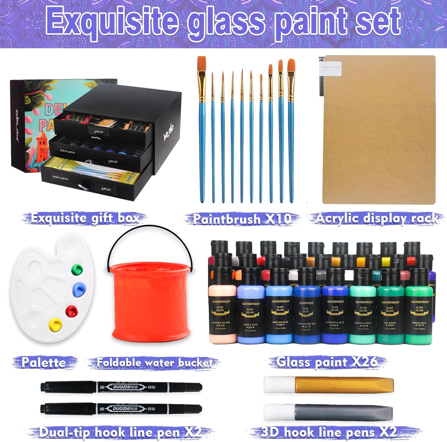- 【Great Gift Idea】 The perfect gift for beginners or seasoned pros, this premium paint set with 6 bonus brushes and 1 palette is sure to please any 'old master' in the making.this brilliant glass window paint set comes with 26– 1 oz bottles in the colors