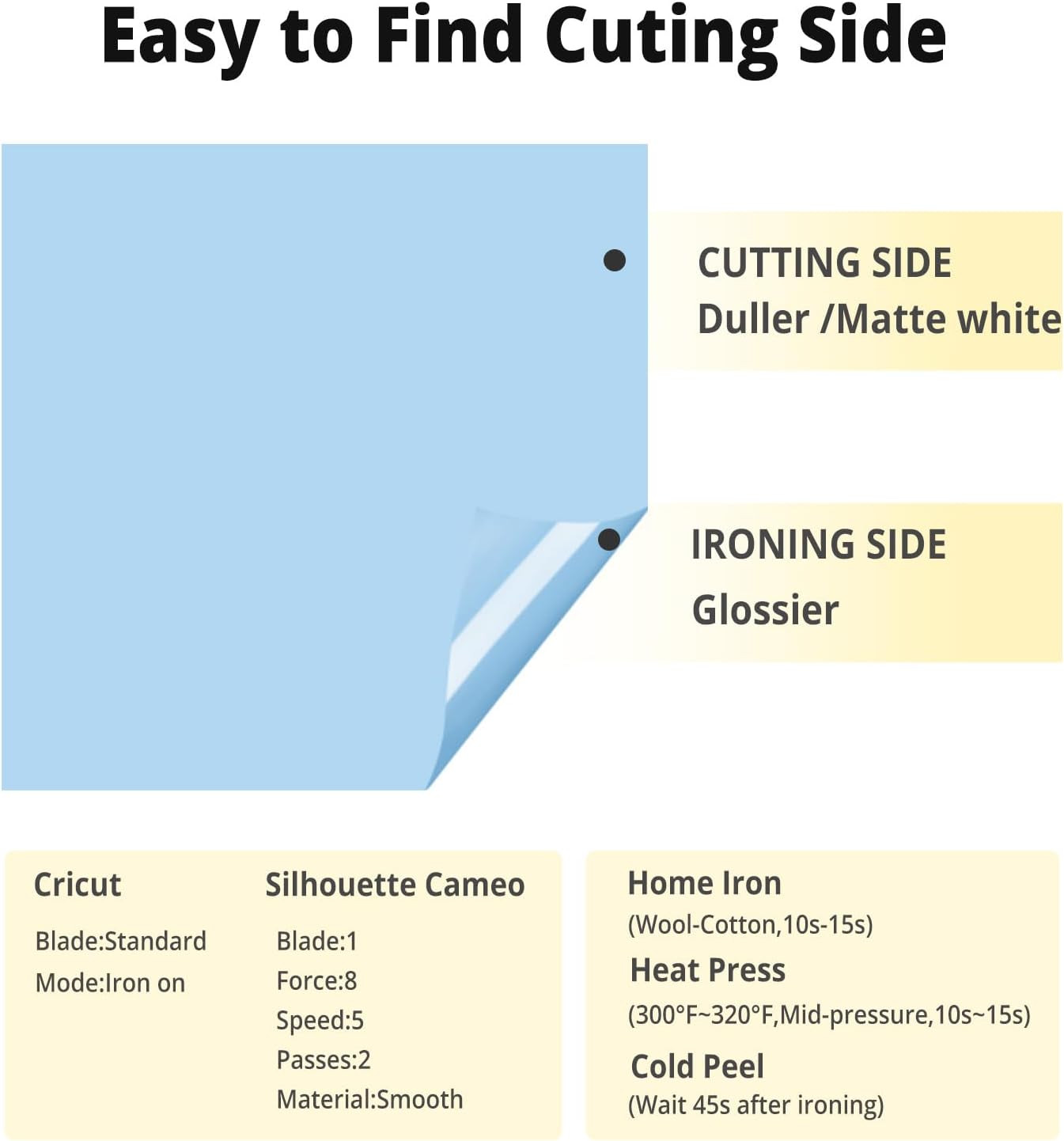- 【SUPER EASY TO CUT & WEED& TRANSFER】Our Light Blue HEAT TRANSFER VINYL is thin but with an excellent cutting application feature. The matte backing is easy to distinguish the cutting side, and you can follow the instructions and set up suitable parameter with cutters, and then easy to weed and complete the complex projects with NO EXTRA TIME. Quickly and easily apply the adhesive-backed HTV to fabric using a hot iron or heat press. Please note that our Light Blue Vinyl Heat Transfer is COLD peel