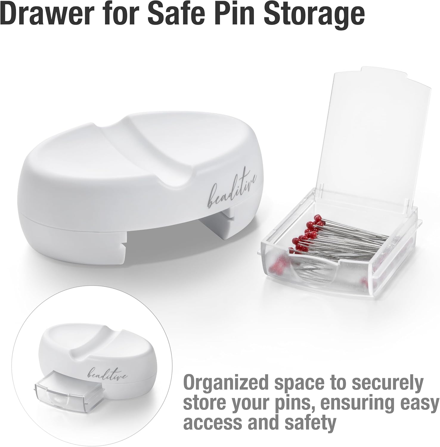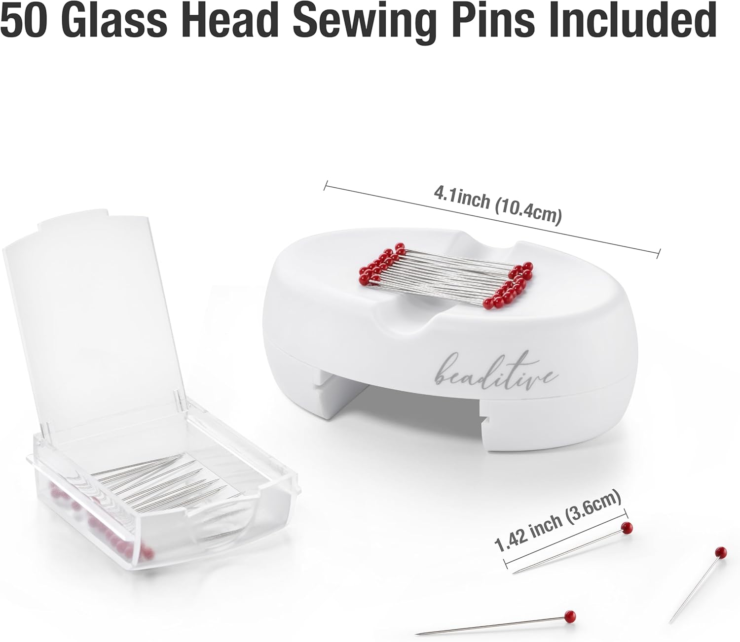 Beaditive Magnetic Pin Cushion with Drawer - Strong Magnet Pin Holder Cushions for Sewing - 50 Glass Head Quilting Pins Included - Chic Pincushion Caddy for Sewing Pins, Paper Clips, Screws โ White