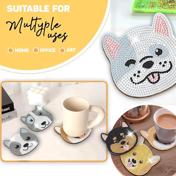 - Dogs Coaster Set: You will receive 8 cute dog paw diamond art coasters with 1 holder, a variety of colorful diamond drills, adhesive, clay, and pen, providing ample quantity and various designs to easily meet your dessert serving needs with this adult craft kits.