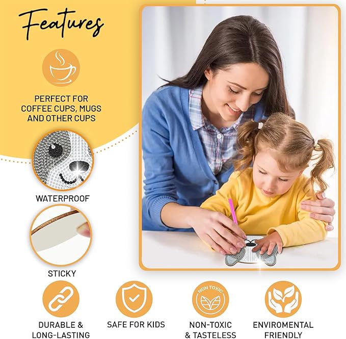 - Easy Installation: This diamond painting kits come with diamond painting tools that allow you to complete 8 coasters. Simply peel off the protective film on the coaster, locate the corresponding fake diamond based on the numbers/letters on the coaster (marked on the bags), and start crafting. Finally, attach the button pad to the back of the coaster.