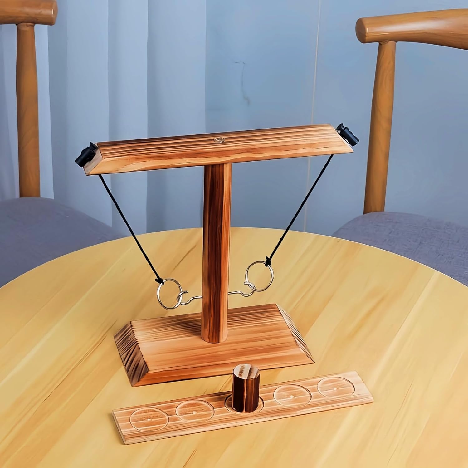 - 【Rules of the game】The 2 player game is to place the wooden cup in the middle of the circle, pick up the circle and go! For each hook you take, move the wooden cup 1 space towards your opponent. The player wins when the wooden cup is moved away from the end of the ladder. Agree on a bet with your competitor before the game and play each style of game.