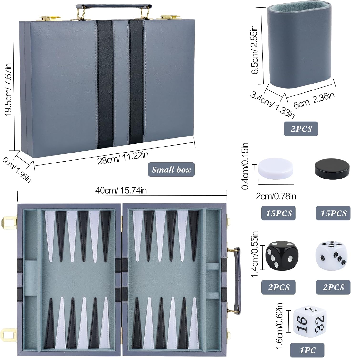 - Small 11'' backgammon set in a grey faux leather case with two gold metal latches and comfortable leather handle for easy transport.