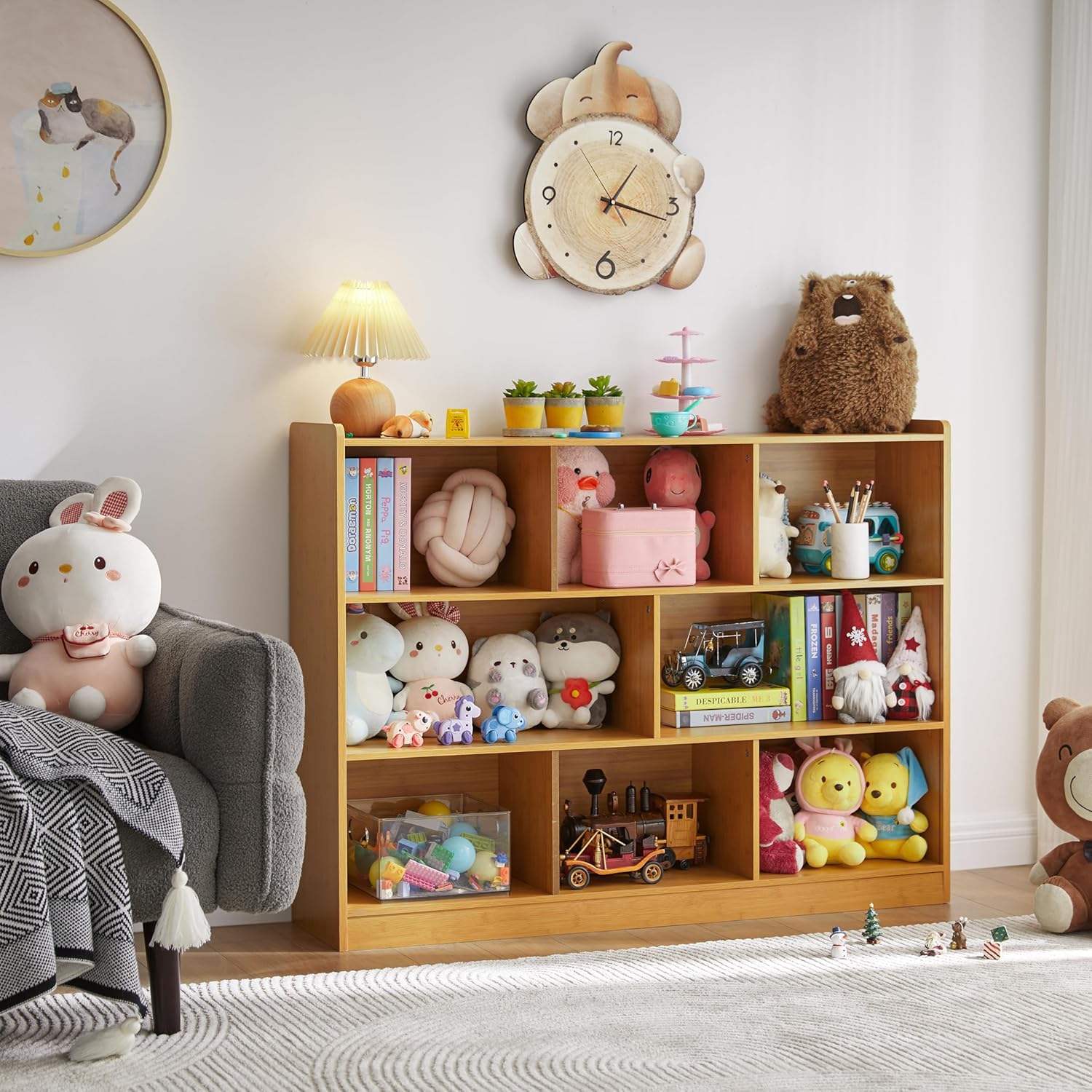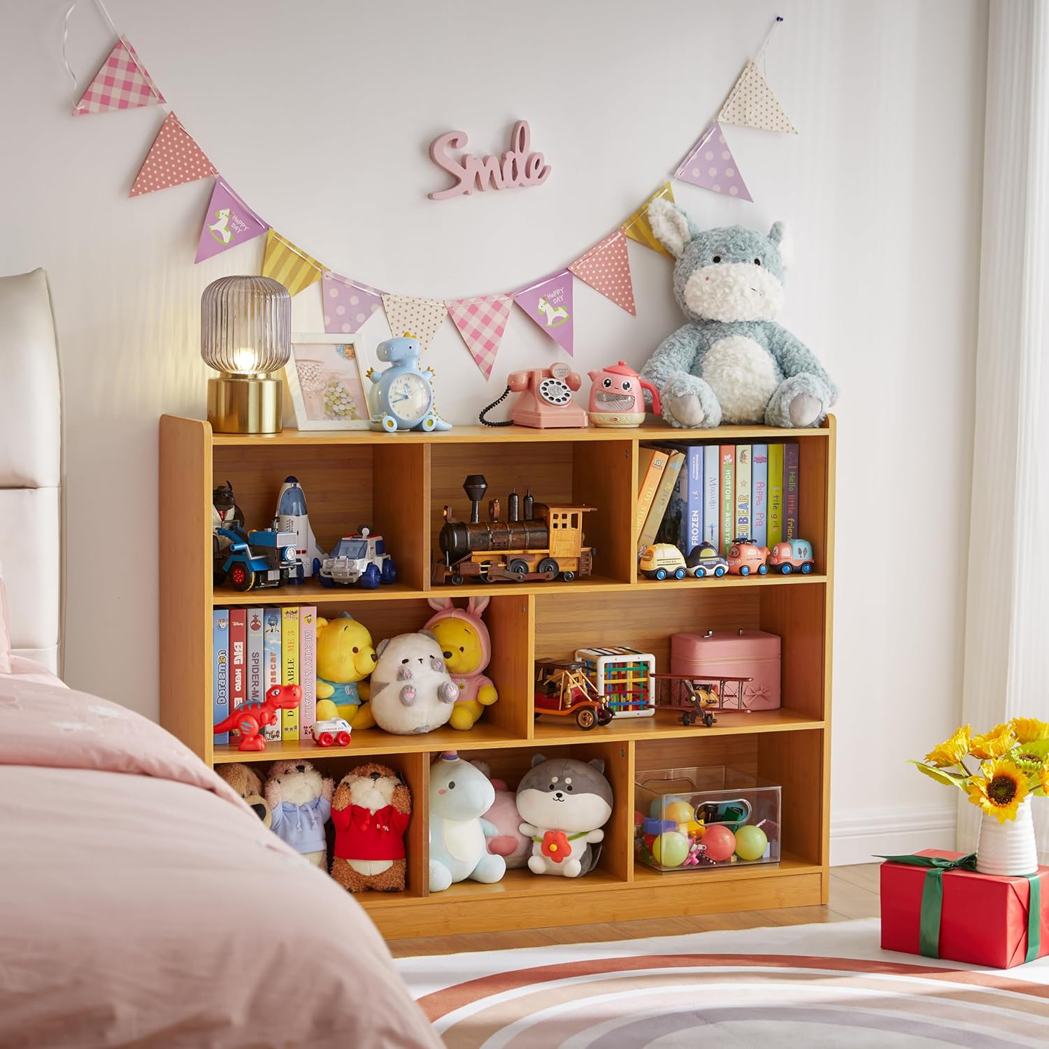 3-Tier Bookshelf, 8-Section Wooden Bookcase, Storage Organizer with Anti-Tilt Device, Modern Storage Display Cabinet for Living Room, Classroom, Kid’s Room (Natural)