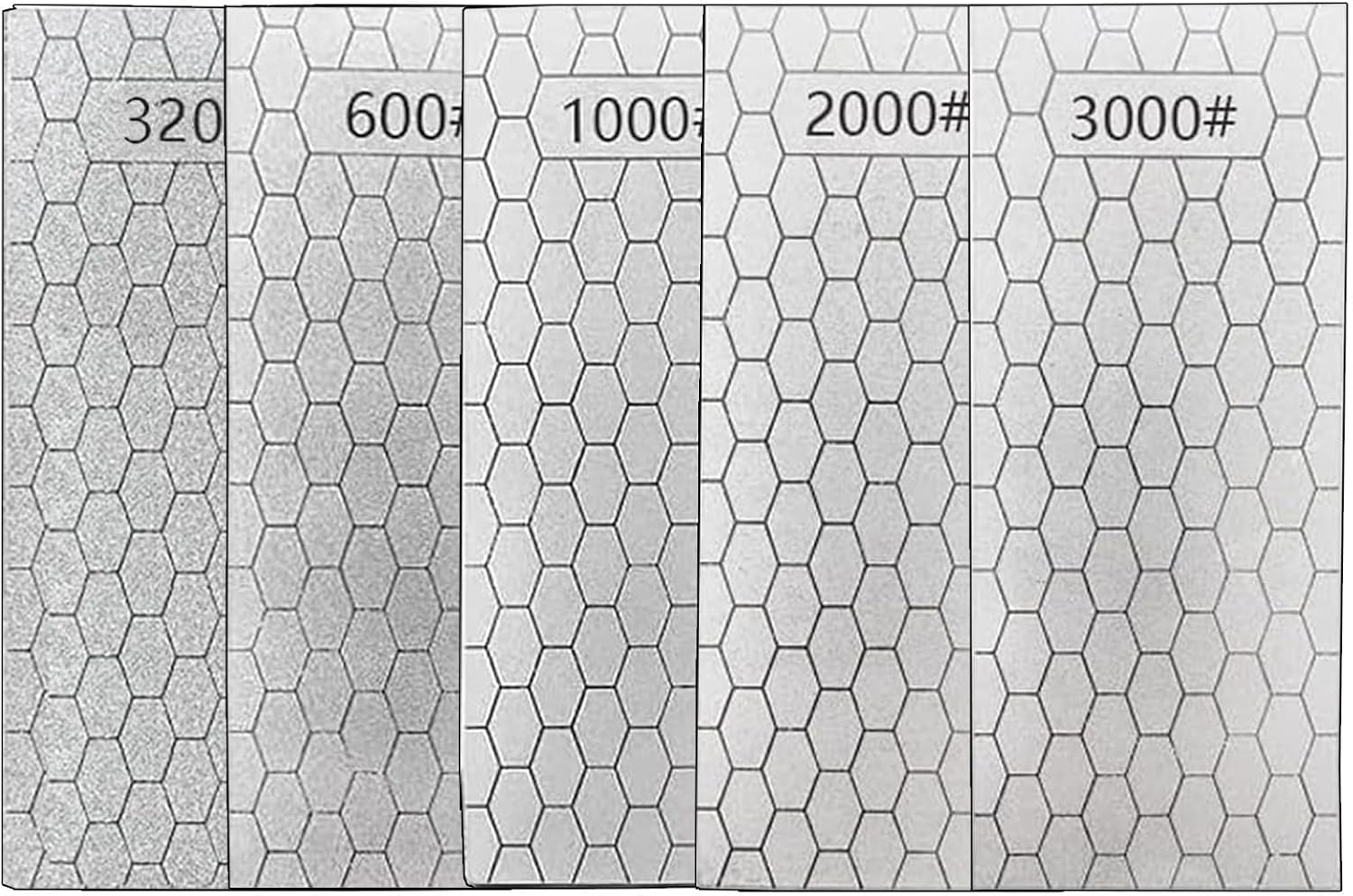 - 5 Diamond Sharpening Plate: 5 pieces grinding stones with anti slip base,made of durable diamond material. They respectively are #320 #600 #1000 #2000 #3000