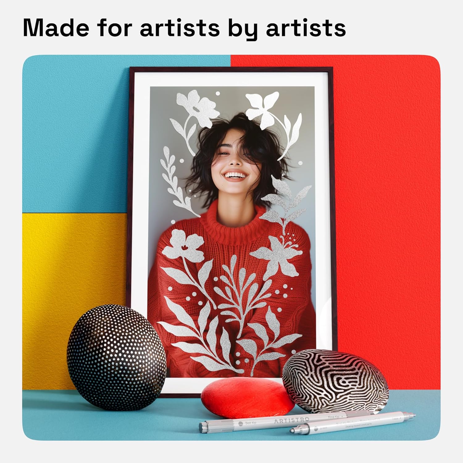 ARTISTRO 2 Silver Dual-Tip Acrylic Paint Pens - Multisurface Markers for Glass, Rock, Fabric, Wood, Plastic & More - 5mm Dot + 1mm Fine Tips