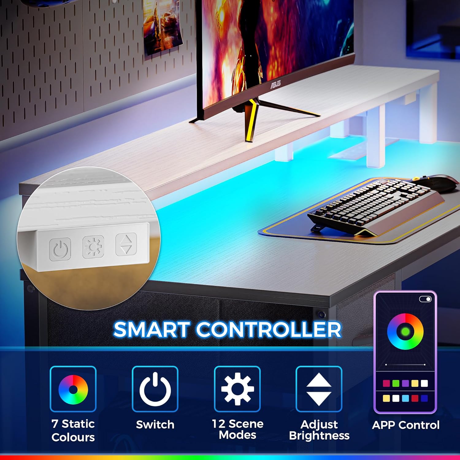 - ăL Desk With LED LightsăPATENT PENDING! Create the perfect ambiance for gaming or working with this computer desk. Choose from over 60,000 colors and enjoy the timing mode, mic mode, and music mode via the App. Alternatively, use the smart controller to switch between 12 scene modes, adjust speed levels, and set 3 brightness levels. Plus: Contain patent pending drawer slide