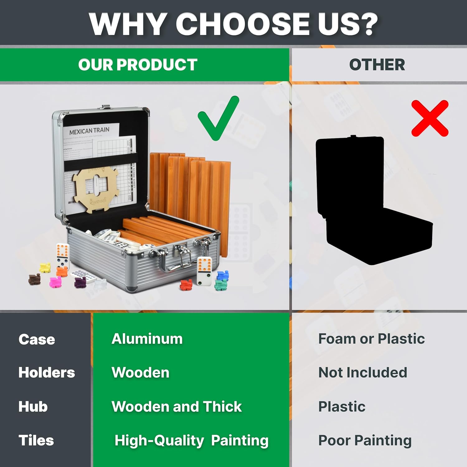 - Mexican Train with Numbers Set Included: 4 Wooden Tile Holders and Hub, 91 Tiles with numbers, 9 Plastic Trains, Score Pad, Instruction, and Aluminum Carrying Case