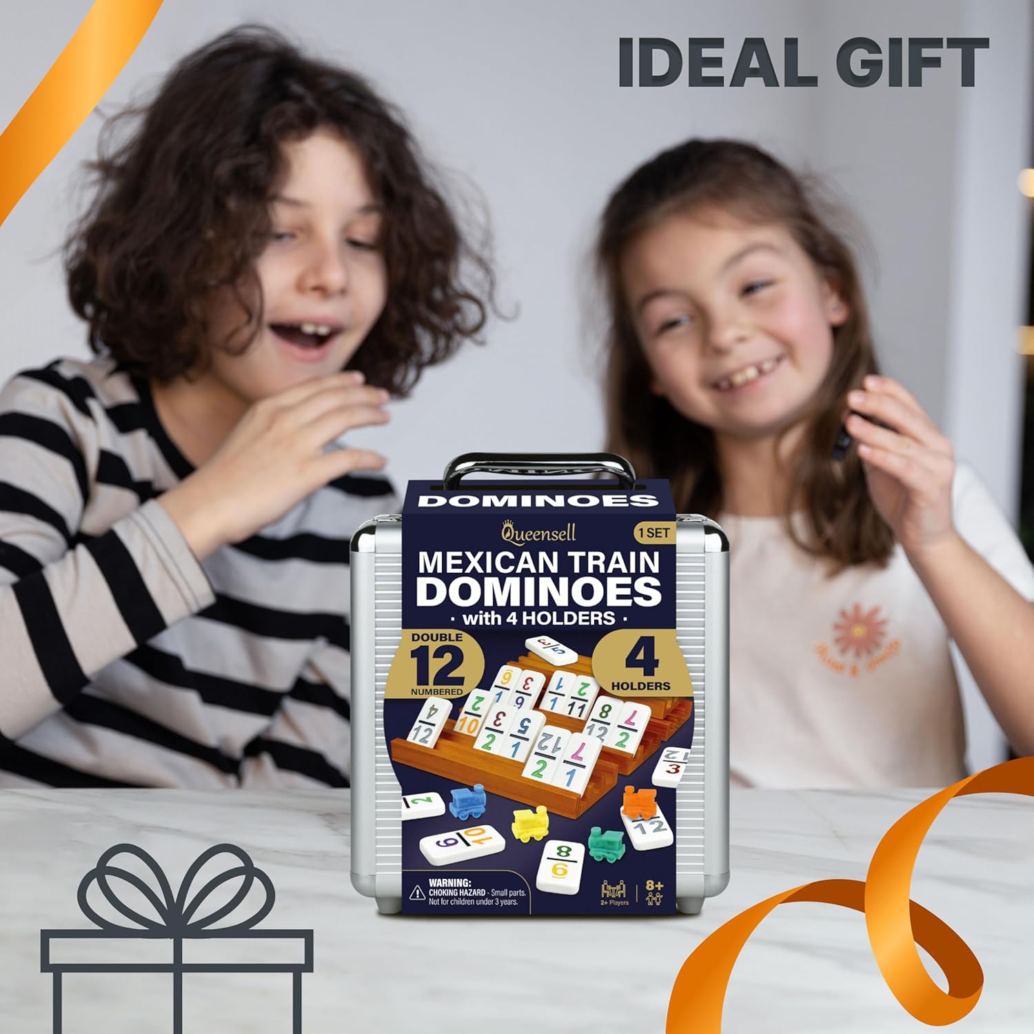 Queensell Mexican Train Dominoes Set with Numbers and 4 Holders - Wooden Hub and Domino Holders - Double 12 with Numbers (D12 Numbers + 4 Holders)