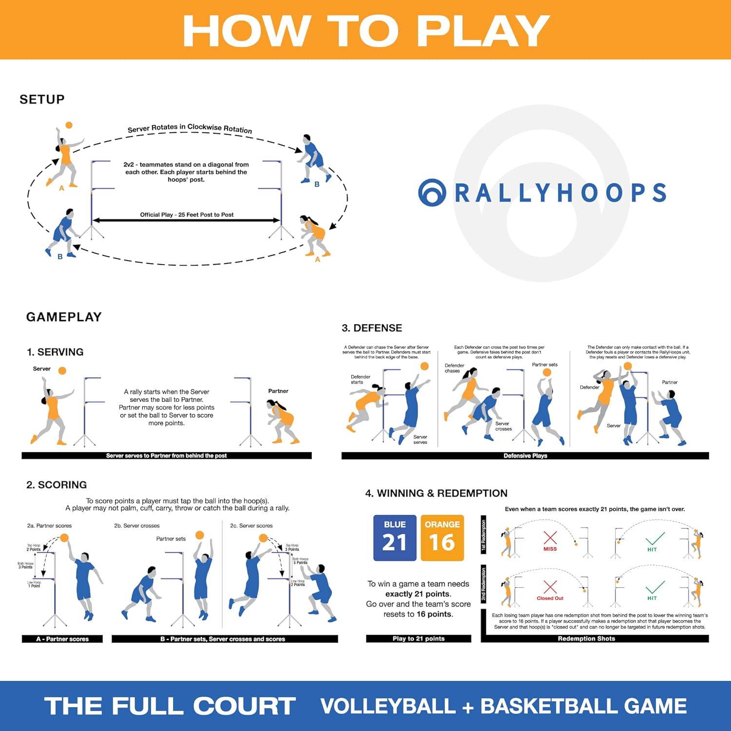 - UNITE, COMPETE, AND BUILD COMMUNITY: RallyHoops isn’t just a game—it’s a movement. Perfect for family fun, friendly competitions, and local tournaments, this full court Volleyball & Basketball game fosters community spirit, supports local charities, and encourages athleticism and healthy competition across the globe.