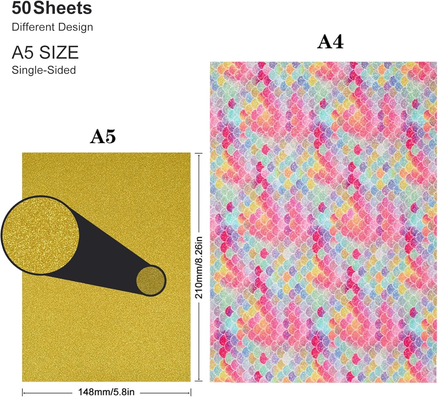A5 GlitterTextured Scrapbook Paper - 50 Sheets Assorted Colors Designs Embossed Holographic Art Paper Pack for Greeting Cards Scrapbooking Collage Holiday Crafting