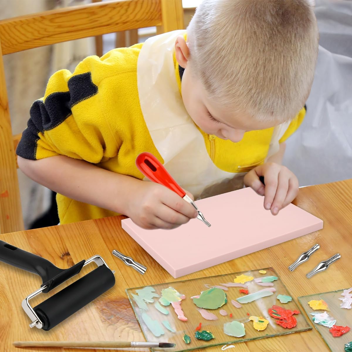 - 【High Quality】- Linoleum block printing kit is made with the highest quality rubber with good elasticity. Carving cutter and roller is made of nonslip plastic handle for easy to grip and easy to operate. Stainless Steel Carving Blades speedy cut, speedy carve whether hard or soft substrates.